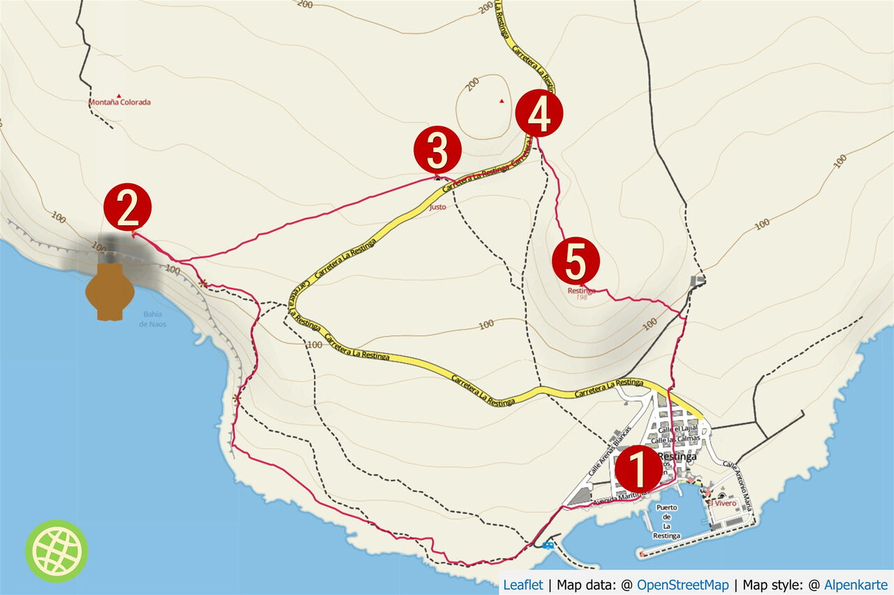 Ein wegloses Stück erfordert Erfahrung bei der Navigation im weglosen Gelände. Bis auf den steilen und gerölligen Abstieg von der Montana Restinga eine einfache Wanderung. Art des Weges: 10 % Straße und 90 % Pfad. Zusatzausrüstung: Wanderstöcke. Einkehr: keine auf der Wanderung; das Fischrestaurant La Vieja Pandorga in einer Seitenstraße zur Promenade in La Restinga. Beste Wanderzeit: ganzjährig. Hinweis: In der Zeit von Ende Februar bis Anfang Juli ist die Besteigung der Montana de Puerto de Naos untersagt, um die Niststätten der dort ansässigen Vögel zu schützen. Variante: Quert man direkt hinter dem Wegpunkt (03) die Straße und läuft zunächst weglos in die Senke herunter, im weiteren Verlauf parallel zur links liegenden Montana Restinga, so trifft man auf talwärts führende Lichtmasten und einen Pfad, der in die Zubringerstraße nach La Restinga mündet. Mit dieser Variante meidet man den steilen Abstieg von der Montana Restinga. Somit ist der Schwierigkeitsgrad der Wanderung einfach, also blau.