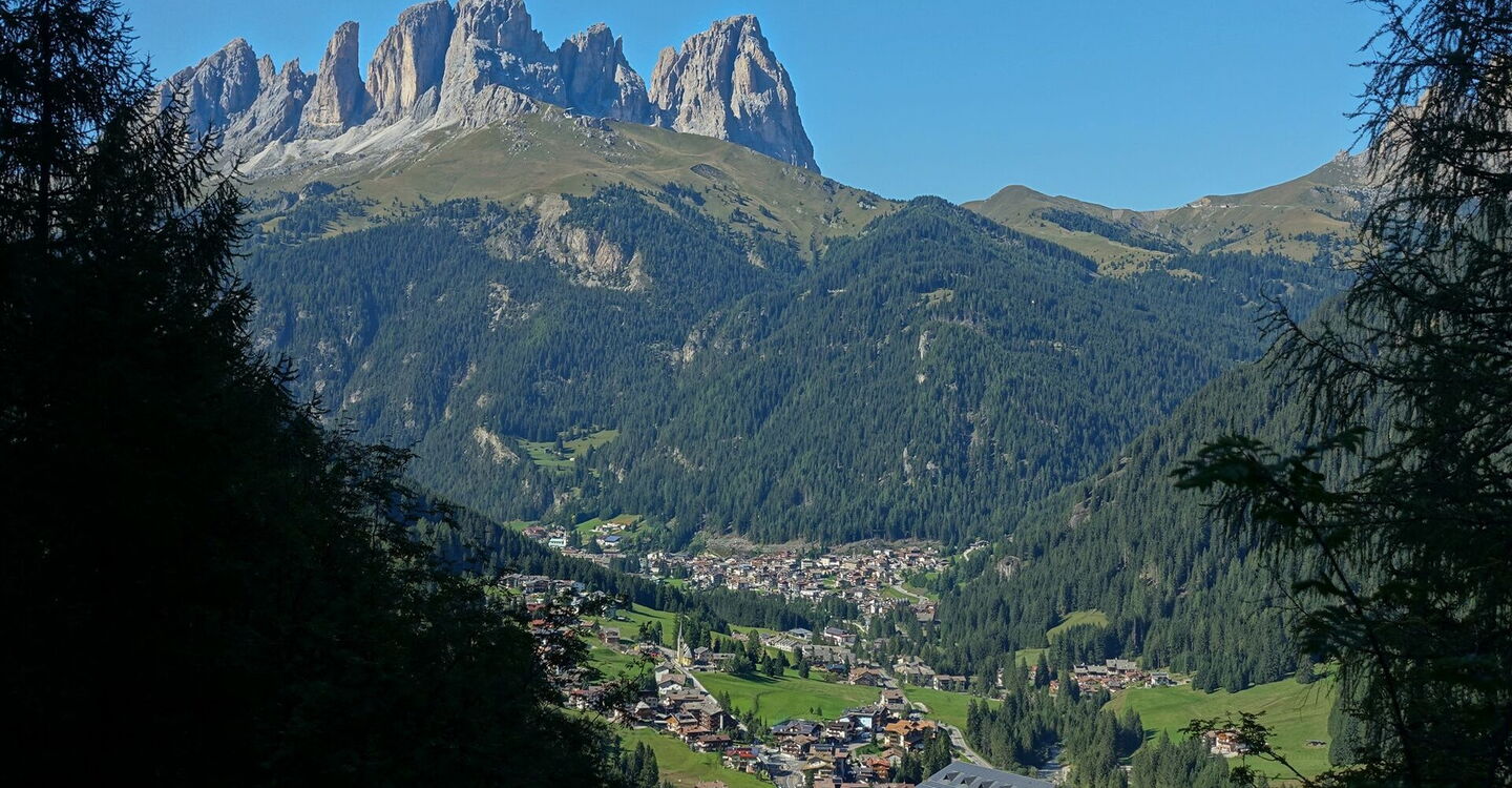 Dort, wo sich der Sentiero in drei Äste aufteilt, gehen wir ganz rechts, nun steil bergauf. Nach einem längeren Aufstieg erreichen wir ein Bachdelta mit einer kleinen Staustufe. Hier gehen wir scharf rechts, überqueren den 04 Bachlauf (1.684 m) und erreichen die von rechts kommende Forststraße aus Alba di Canazei, zugleich der Wanderweg 602.