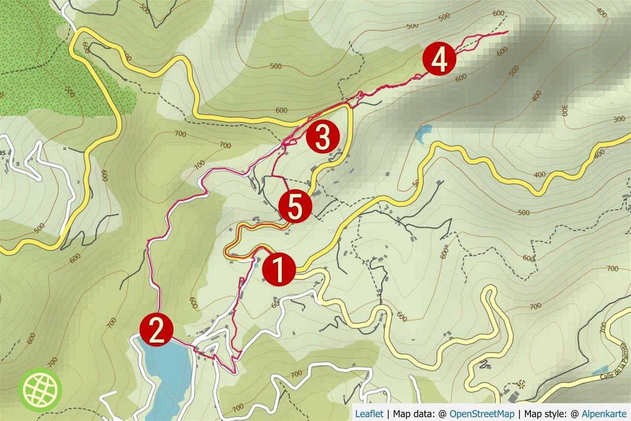 Vom (01) Start und Ziel, der Bar Casa Luis Comidas (590 m), gehen wir auf der Straße Richtung Vallehermoso, um nach 130 m links die Treppe bergauf zu nehmen und auf der Asphaltstraße zur Ermita Santa Rosa del Lima zu gelangen. Im weiteren Verlauf gehen wir an dem Eckhaus links vorbei - nicht auf der Straße. Bei der folgenden Weggabelung passieren wir die Häuser. Der Asphaltweg geht in einen Pfad über und wir gehen oberhalb eines Hauses in einer Linkskurve durch ein Barranco, um bei der Asphaltstraße rechts zu gehen und nach der folgenden Rechtskurve der Straße diese sofort wieder auf den Pfad nach links zu verlassen.