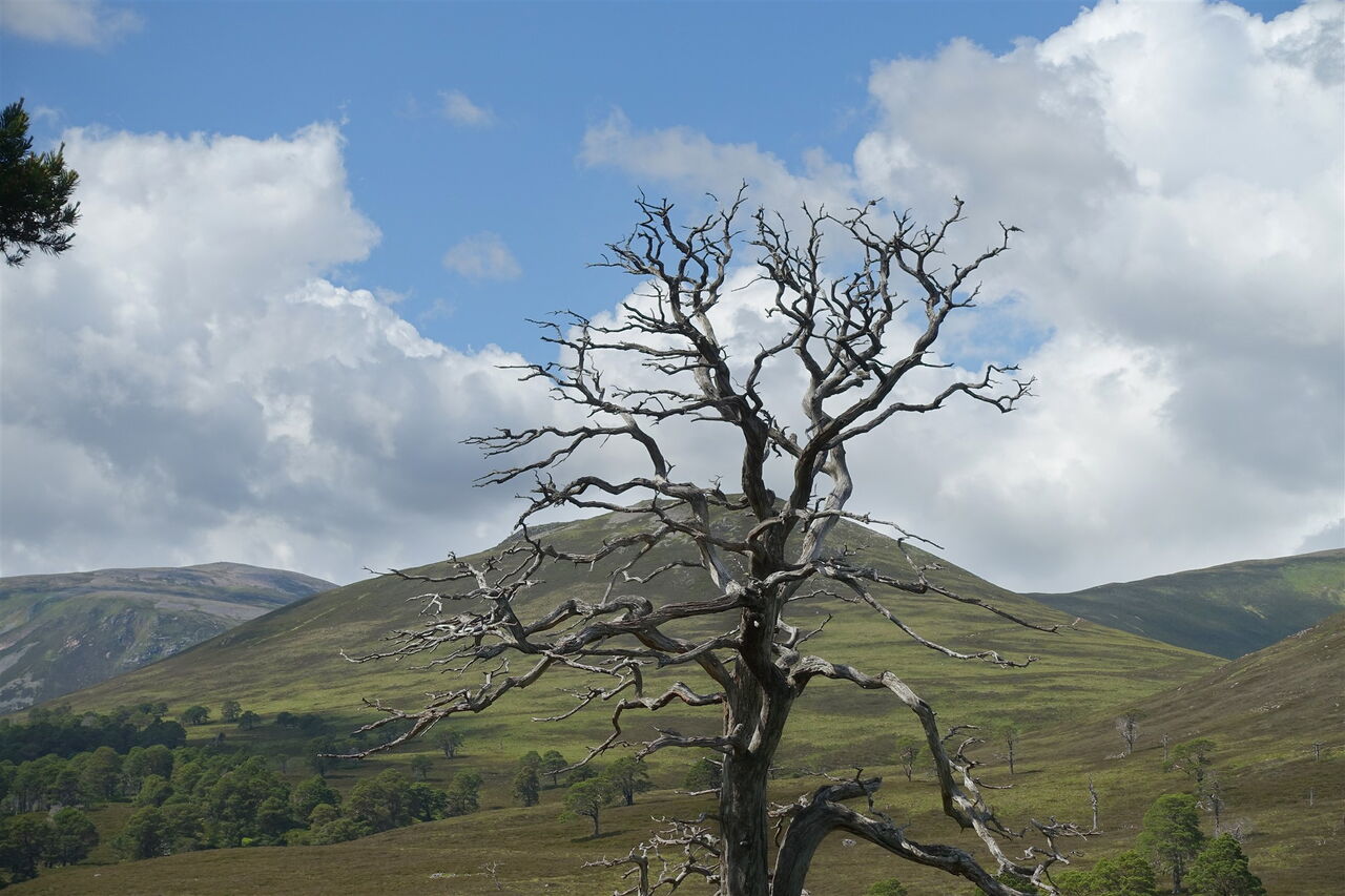 Der weitere Abstieg ist eindeutig – gemächlich, fast schon zu gemächlich – und verläuft parallel zu einem Bachlauf, der im weiteren Verlauf zum Flusslauf wird. Sobald wir zwischen unserer Position und dem Bachlauf eine Fahrspur sehen, verlassen wir den Pfad nach rechts und wechseln auf einen schmalen abzweigenden Pfad. An dieser Stelle, dem 03 Beinn A Bhuird North & South View (601 m), hat man ebenfalls einen wunderschönen Blick. Dieser Trampelpfad quert die soeben angesprochene Fahrspur und mündet in einen weiteren Pfad, dem wir zunächst rechts und kurz später durch eine Linkskurve folgen. Ja, dann gelangen wir wieder auf eine Ausbaustrecke des Wanderwegs, was das Vorankommen ungemein beschleunigt.