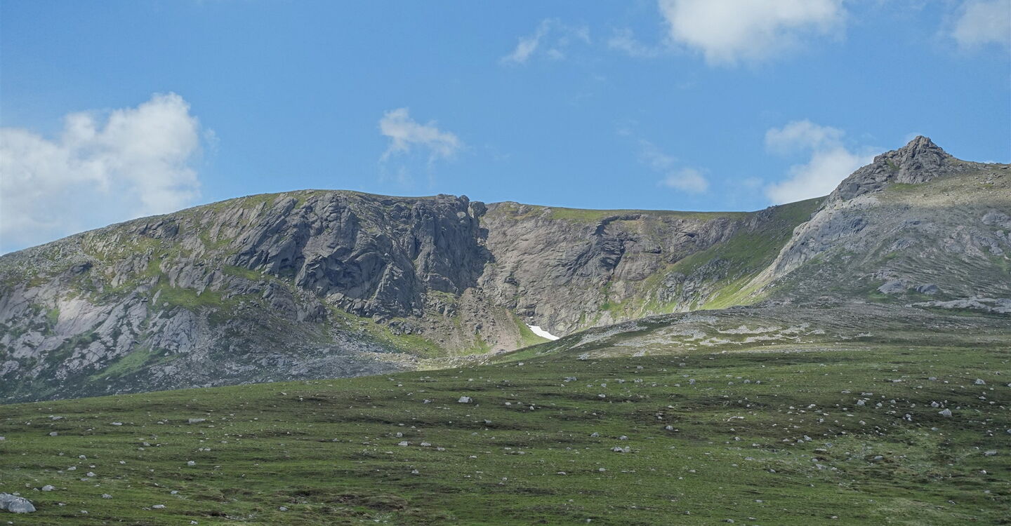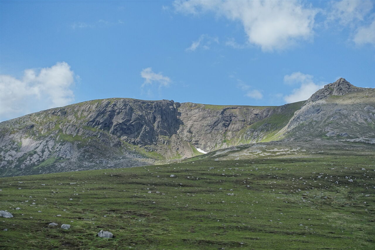 Wir gehen zunächst auf dem gleichen Weg zur Einsattelung zurück und beginnen von dort mit dem Abstieg. Aus dem schmalen Tal erheben sich steil die Berghänge zu beiden Seiten. Bei einer Linkskehre auf dem angelegten Pfad kann man vom Wegpunkt 02 Beinn A Bhuird North Top View (730 m) geradeaus in das felsige Bergmassiv schauen.