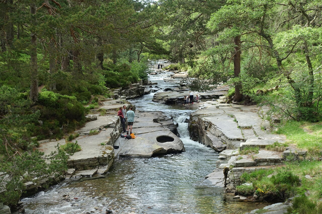 Ca. 1,2 km hinter einem Waldstück, an dem wir links vorbeigegangen sind, erreichen wir ein weiteres Waldstück, hier zweigt nach halb rechts ein kleiner Pfad ab. Wir erreichen eine Brücke, unter uns hindurch fließt über kleinen Stufen das 05 Quoich Water (352 m) seicht bergab. Wir queren nicht die Brücke, sondern gehen links am Flusslauf bergab, bis wir eine Fahrstraße erreichen, der wir rechts bis zum Ausgangspunkt folgen.