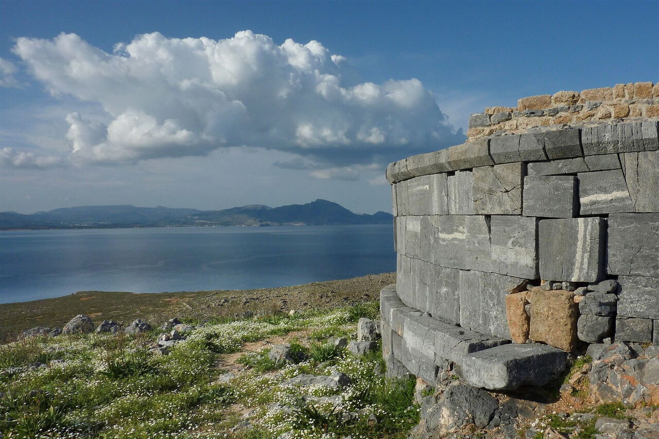 Wir erreichen abermals die Überreste einer Steinmauer, folgen ihrem Verlauf 10 m und gehen nun halb links und weglos auf das (04) Grab des Kleobulos (49 m) zu. Kleobulos lebte im 6. Jahrhundert vor Christi und war einer der 7 Weisen der Antike. Er lehrte philosophische Zitate und war eine hoch angesehene Persönlichkeit der Antike. Man sagt, sein Grab befindet sich auf dem markanten Felsen am Kap Ajios Amilianos oberhalb von Lindos. Ob Kleobulos tatsächlich dort begraben war, ist nicht erwiesen, denn Archäologen fanden ein gänzlich geplündertes Grab vor.