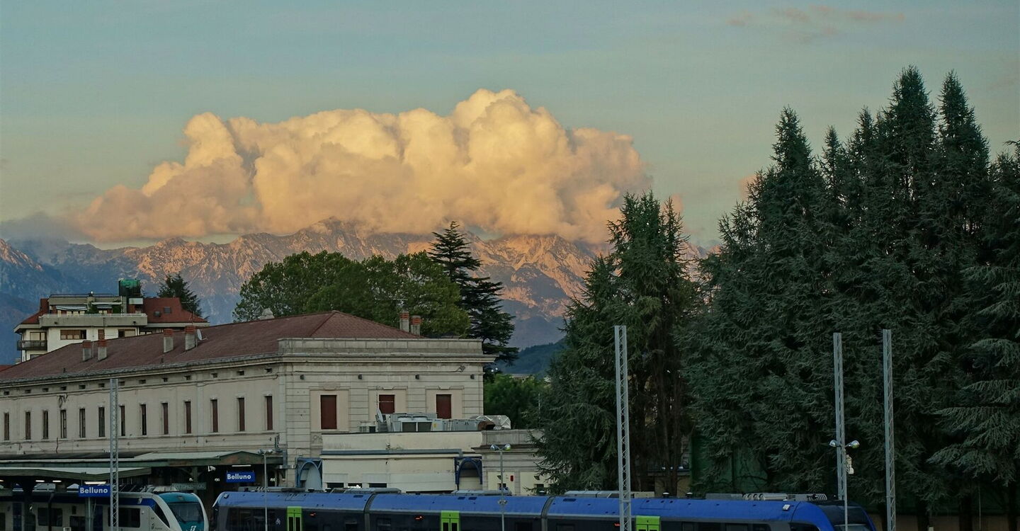 Links vom nachfolgenden Kreisverkehr gehen wir über den Zebrastreifen, dann einige Meter rechts, um schließlich links auf einen Weg durch eine Grünzone zu gelangen. An dessen Ende gehen wir einige Meter rechts und sofort links, nun wieder entlang einer Straße. Die nachfolgende Hauptstraße überqueren wir über die Fußgängerbrücke und gehen dann links entlang der Hauptstraße, um anschließend rechts über Treppen und eine Unterführung zum Busbahnhof und zur Bahnstation 05 Stazione Belluno (429 m) zu gelangen.