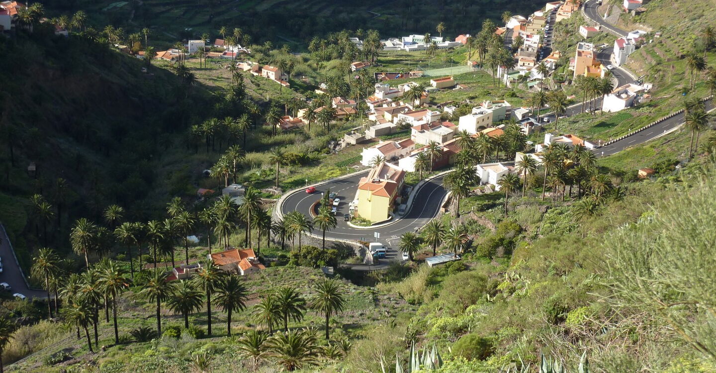 Busanbindung: Linien 1 und 6. Aus dem unteren Valle Gran Rey fahren wir auf der GM-1 talauswärts Richtung Arure. Nach 4,7 km erreichen in einer scharfen Linkskurve den Abzweiger Richtung Lomo del Balo. Hier befinden sich der Parkplatz und die Bushaltestelle. Geokoordinaten Parkplatz: N28 07.214 W17 18.640 und 28.120233 -17.310667.