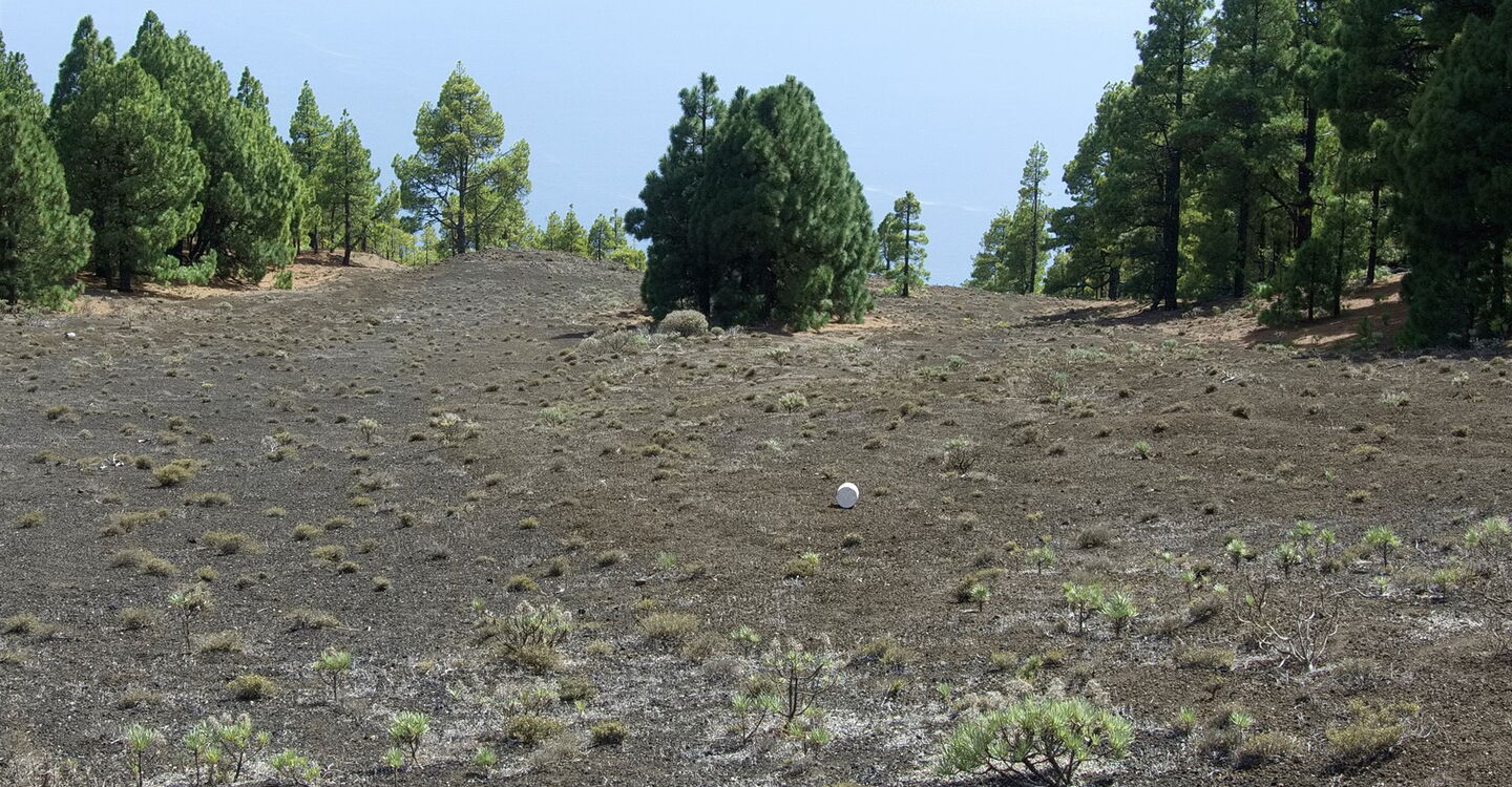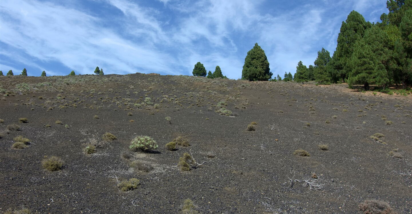 Nach nur 325 m, bei einem Holzpfeiler mit einer rot-weißen Markierung, (04) verlassen wir die Piste (1490 m), gehen weglos halb links über das Lapilli und orientieren uns dabei an einem kleinen Kiefernwald, sodass wir 50 m rechts neben den Kiefern ankommen. Falls wir zu weit links gegangen sind, muss die Wegrichtung noch ein bisschen justiert werden, denn dort befindet sich ein steiler Abbruch, den man bequem durch das weiche Gestein umgehend kann. Wir gehen schließlich 70 m nach rechts auf der Schotterpiste. Schauen wir den Abhang nach links herunter, so sehen wir eine große Freifläche mit Lapilli, die sich nach unten hin verjüngt.