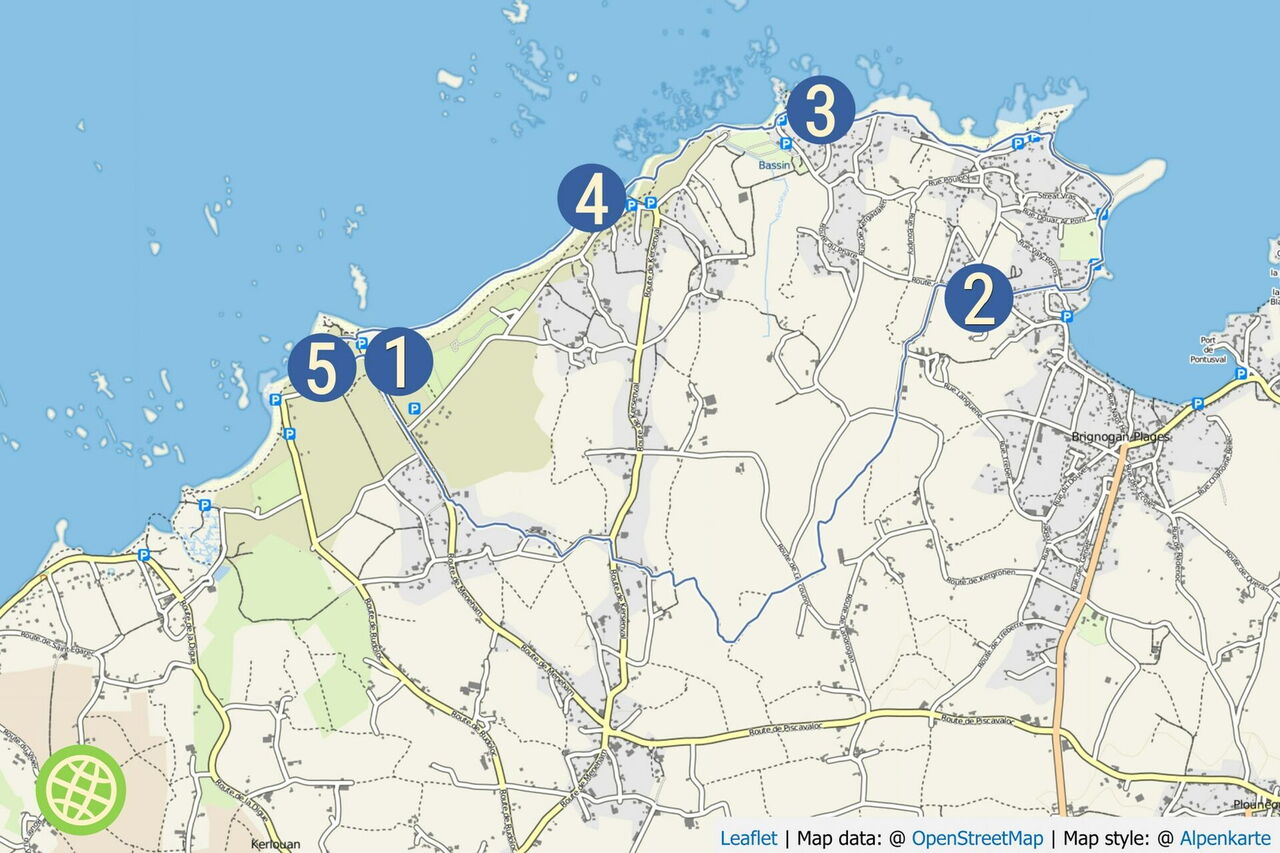 Wir setzen unseren Spaziergang auf der Rue de Menhir fort, bis wir dann links in die Rue de Morabren abzweigen – die Straße mit dem Einfahrtverbotsschild. Dort, wo sie endet, gehen wir nur wenige Meter rechts, um dann sofort wieder links abzuzweigen. An der großen Bucht gehen wir links über den Parkplatz und an der Promenade entlang. Nach einem kurzen Stück auf der Straße gehen wir nun in die Sackgasse. Im weiteren Verlauf kommen wir an einem Leuchtturm und am Plage des Chardons Bleus vorbei. Wir gehen zwischen dem Strand und dem Hotel de la Mer hindurch und weiter bis zur 03 Pointe de Pontusval (10 m) mit einer kleinen Hafenanlage, einem Strandabschnitt und einem weiteren schönen Leuchtturm.