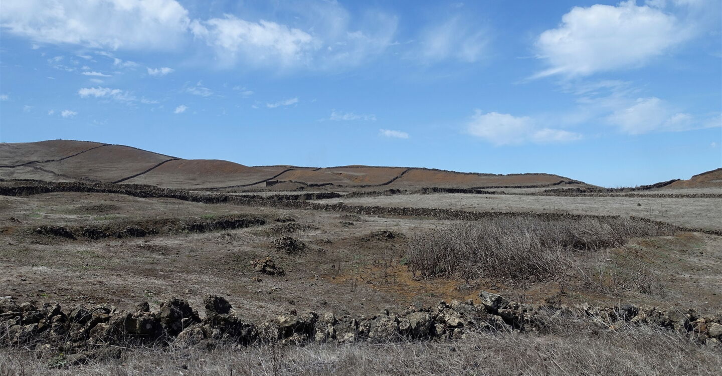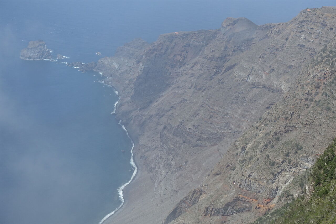 Bei einem Felsen angekommen, ergibt sich ein gigantischer Blick in das 1000 Höhenmeter tiefer liegende Halbrund des El-Golfo-Tals. Es folgt der spektakulärste Teil der Wanderung, die (03) Gratwanderung (1100 m) oberhalb des Risco de Tibataje – definitiv nichts für schwache Nerven. Naja, Trittsicherheit und Schwindelfreiheit – das muss an dieser Stelle noch einmal gesagt werden – sind essenziell. Gleich auf dem ersten Abschnitt müssen wir den ursprünglichen Pfad umlaufen, denn dieser ist nach einem Erdrutsch nicht mehr vorhanden. An vielen Stellen ist der Pfad am Abgrund stark verwachsen, so kann man über die Trockensteinmauer steigen und auf den Feldern und Wiesen parallel zum Abgrund gehen.