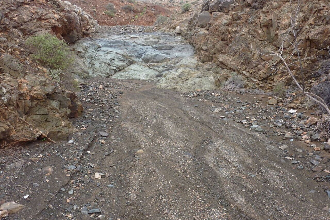 Die ersten paar Meter im Barranco sind noch steinig, aber immer mehr Zuflüsse von rechts und links formen sehr schnell ein breites sandiges Barranco, in dem es nun bequem und leicht bergab weitergeht. Es folgen kleine Wasserfälle, die einfach überwunden werden können – inzwischen ist das Barranco 3 m breit geworden. Wir treffen auf einen markanten Felsen, der quer im Barranco liegt. Nach weiteren 60 m führt von links ein weiteres Barranco in den Hauptstrom. An dieser Stelle, ca. 200 m vor einer künstlich angelegten (04) Staustufe (342 m), verlassen wir das Barranco auf eine zunächst schwer auszumachende Schotterpiste. Sie führt parallel zum nun tiefer liegenden Barranco, direkt zu auf einen künstlich angelegten Staudamm. Nach 130 m und einer langen Linkskehre ändert sich die Wegrichtung auf Nord. Wir gehen nun direkt auf einen weiteren Staudamm zu. Bei der folgenden Weggabelung wandern wir links, bis wir zu einem Barranco gelangen, das den oberen Staudamm nährt.