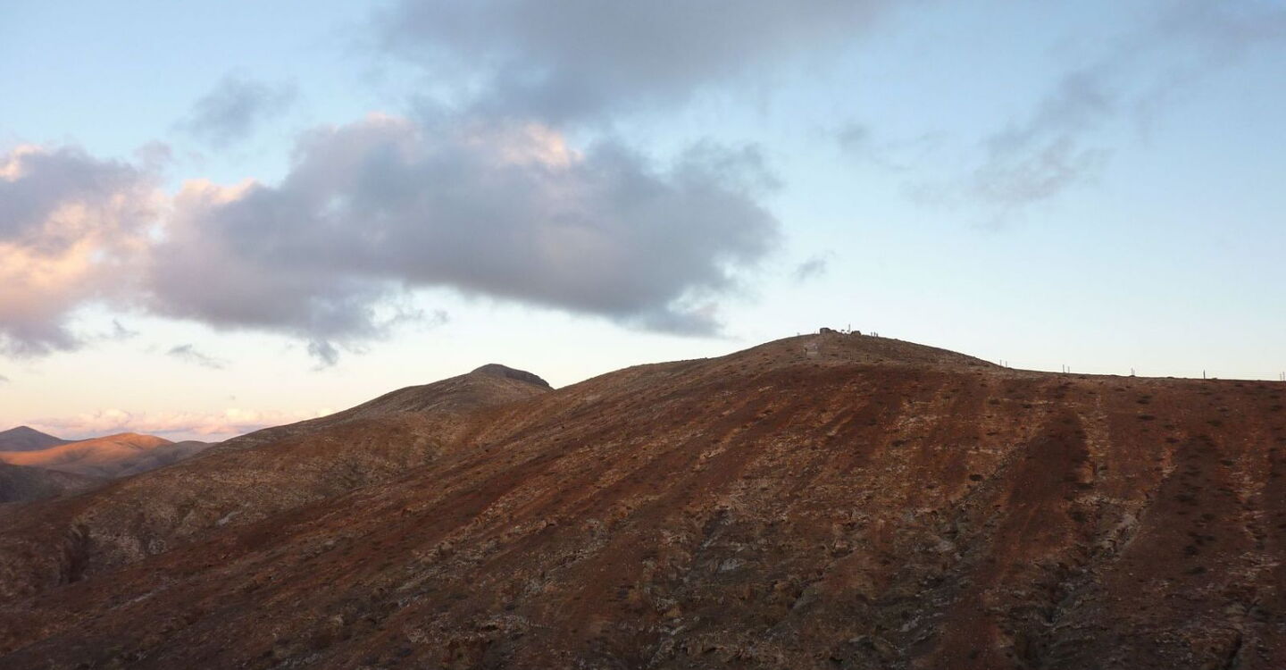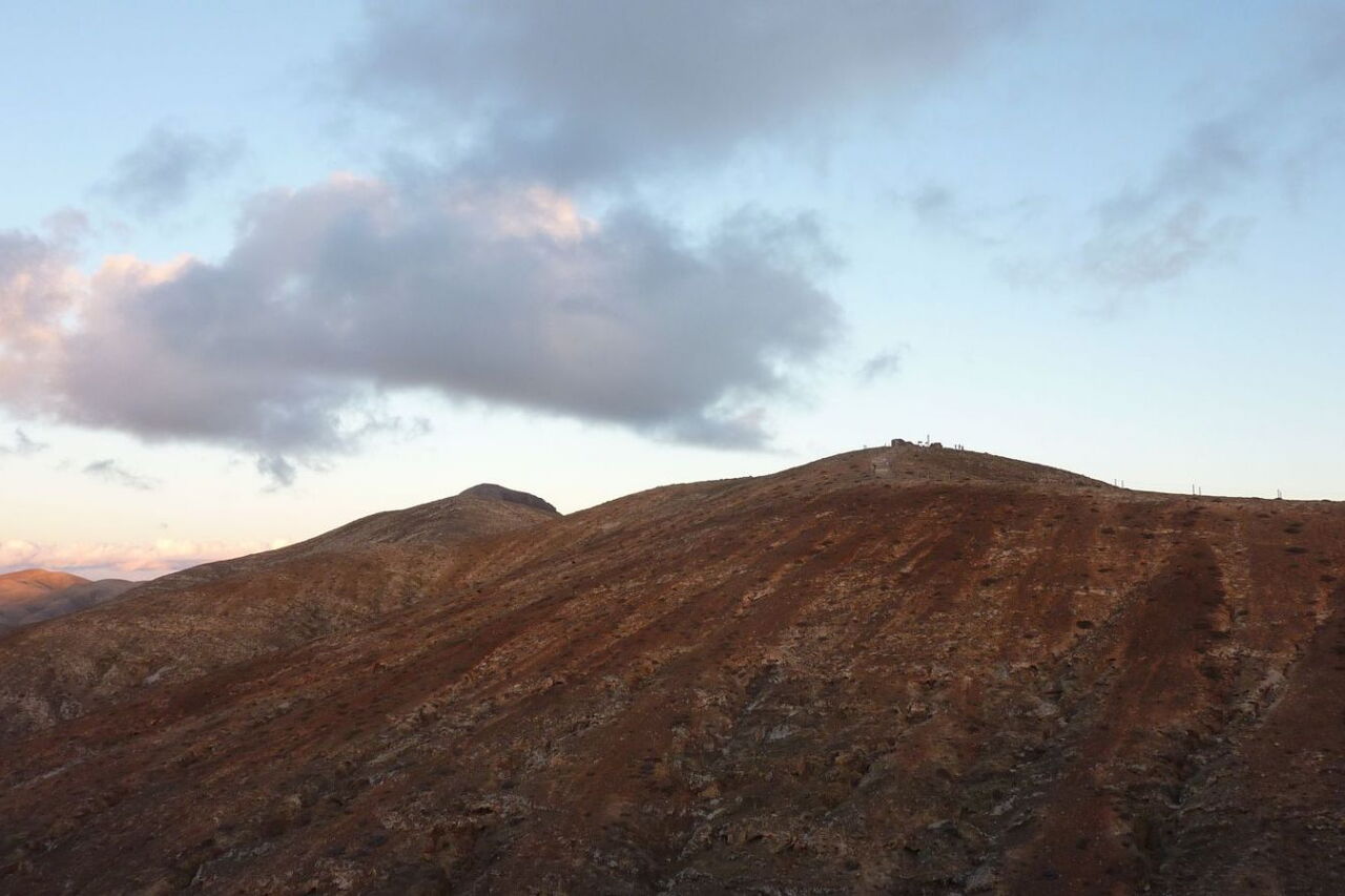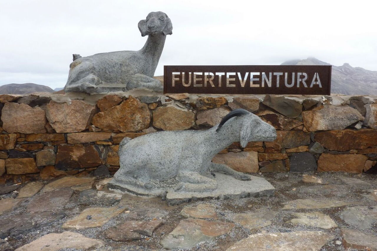Nach nur 60 Höhenmetern und 410 m Entfernung ist bereits der Mirador (02) Astronomico de Sicasumbre (461 m) erklommen. Am Mirador aufgestellte Ziegenskulpturen des bekannten Bildhauers Juan Miguel Cubas ergeben das perfekte Szenario für ein Urlaubsfoto: im Vordergrund die Ziegen mit Familie und am Horizont die Jandia-Halbinsel mit dem gewaltigen Jandia-Bergmassiv. Am Mirador, direkt neben dem fest installierten Fernrohr und einem kleinen Steinhäufchen, führt auf dem vor uns liegenden Bergrücken ein schmaler Pfad in südliche Richtung talwärts.
