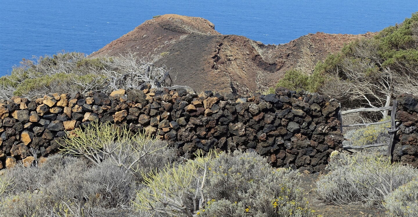 Vom (02) Mirador de Lomo Negro 2 (274 m) sieht man rechts in einem steil abfallenden Felshang einen auffallend gelblich gefärbten Felsen. Er zeugt von einer sogenannten phreatomagmatischen Explosion, bei der das Wasser des Meeres oder des Untergrundes mit dem Magma in Berührung kam. Der intensive gelbliche Farbton entsteht durch die rasche Abkühlung des Magmas. Wir setzen die Wanderung in die eingeschlagene Richtung fort, bis wir an einer Trockensteinmauer entlanggehen.