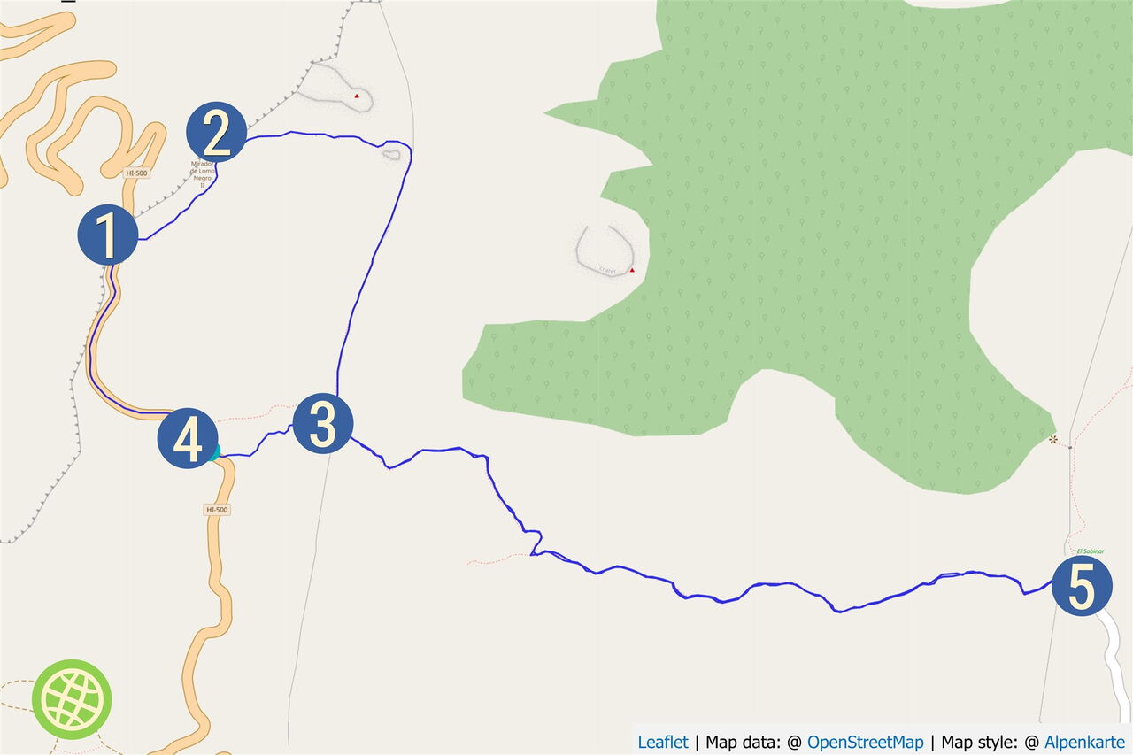 Der Vulkan Lomo Negro, an dem wir uns jetzt befinden, liegt am Ende des Westkammes der vulkanischen Aktivitäten auf El Hierro, in einem Gebiet, das vor etwa 1800 Jahren entstanden ist. Vom Aussichtspunkt kann man sehr schön die Flussrichtung der Lavaströme nachverfolgen: nach rechts Richtung Arco de la Tosca, gerade herunter zum Roque de la Sal und nach links zum Punta del Verdol. Direkt hinter dem (01) Mirador de Lomo Negro 1 (299 m) und der Straße beginnt der angelegte Pfad durch die Vulkanlandschaft zum nächsten Aussichtspunkt.