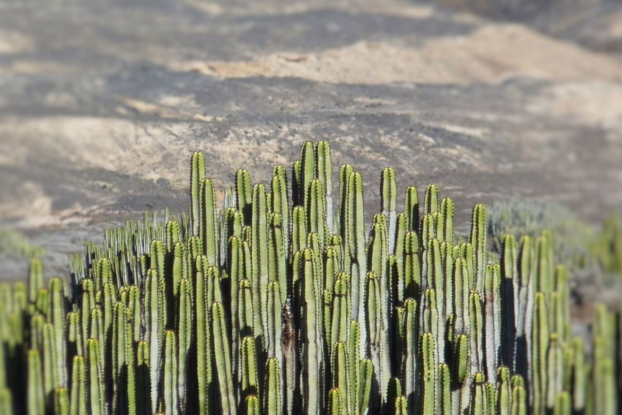Wir haben jetzt bereits 2,2 km zurückgelegt, das Barranco ist sehr eng und steinig geworden. Sobald wir in dieser kargen Gegend auf Höhe der oberhalb wachsenden Wolfsmilchgewächse angekommen sind, steigen wir nach weiteren 700 m weglos aus dem (03) Barranco (233 m) und wechseln auf die Asphaltstraße. Dieser folgen wir bis zum Ende bei der Degollada de los Canarios. Das erste Etappenziel ist erreicht und wir werden mit einem grandiosen Blick auf die 350 Höhenmeter tiefer liegende Küste belohnt.