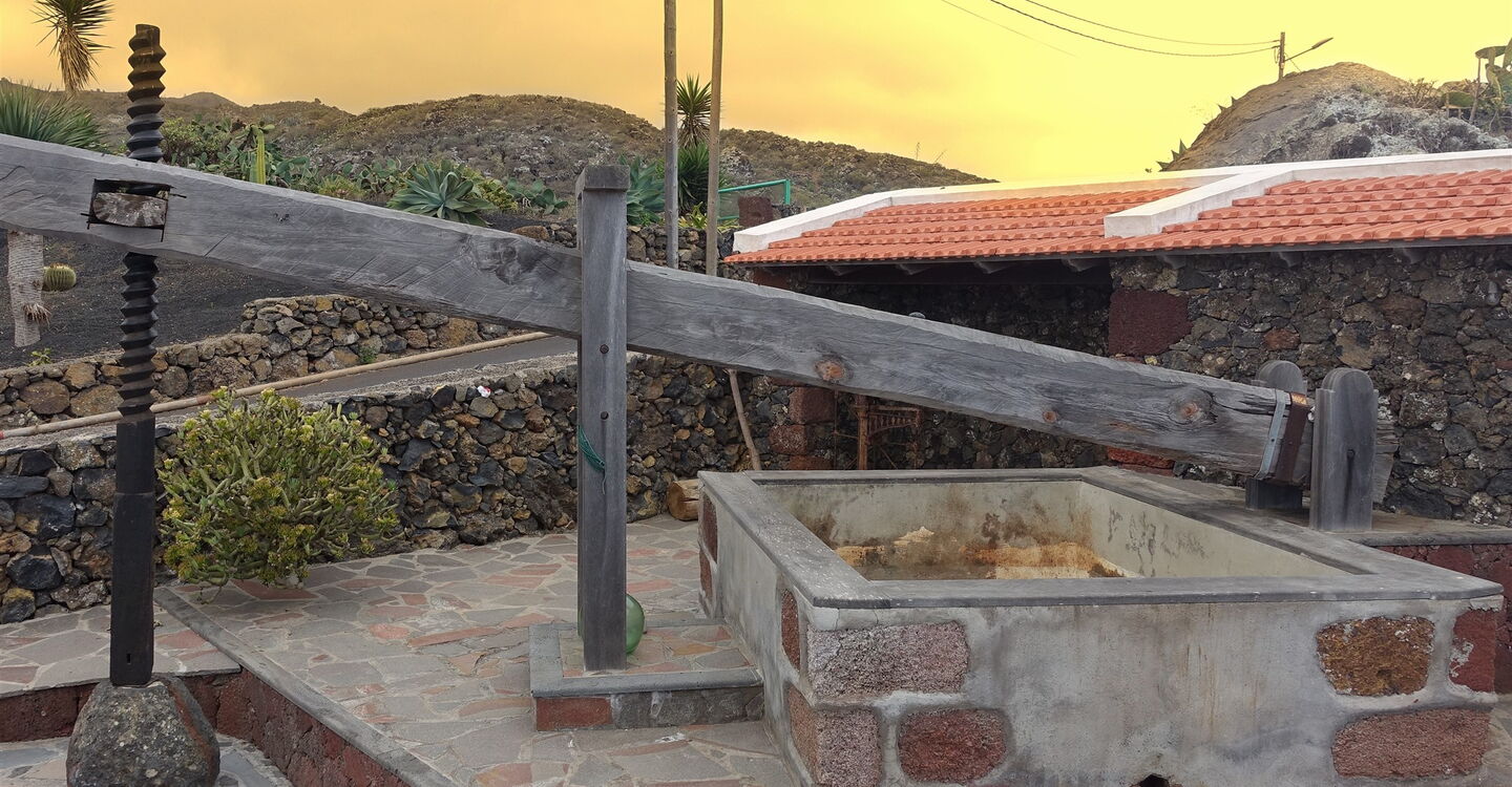 Bei der nächsten Weggabelung führt unser weiterer Weg halb links Richtung El Moconal. Wir ignorieren den Abzweiger halb rechts nach El Golfo. Nach 210 m erreichen wir eine perfekt restaurierte (04) Weinpresse (372 m), auch eine alte Waage gehört zu der Sammlung. An dem Haus neben der Weinpresse, leider auf einem Privatgrundstück, sind die typischen Werkzeuge, die im Weinanbau Anwendung finden, künstlerisch an der Hauswand befestigt.
