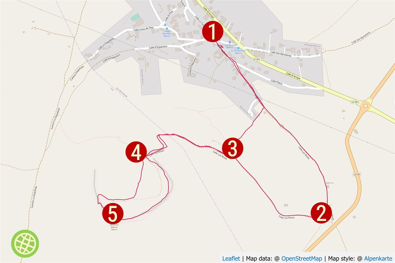Von der Bushaltestelle (01) Montaña Blanca (271 m) gehen wir in südöstlicher Richtung und verlassen die Hauptstraße halb rechts an der Weggabelung in die Calle las Rosas. Es erfolgt nach 75 m eine weitere Weggabelung, an der wir ebenfalls halb rechts gehen. Wir ignorieren den Abzweig zu dem etwas erhöht liegenden Haus. Wer mit dem Bus angereist ist, kann die folgende Variante gehen: Nach weiteren 60 m, hinter dem erhöht liegenden Gebäude und einem kleinen Haus direkt an der Straße, können wir nun rechts weglos bergauf eine weite Umgehung auf der Schotterpiste abkürzen. Man sieht in 300 m Entfernung, erhöht im Hang des Vulkans, einen Wassertank mit einem Sendemast, den wir als Orientierungspunkt nehmen. Der Aufstieg ist steil und der Untergrund eine Mischung aus Sand und Schotter.