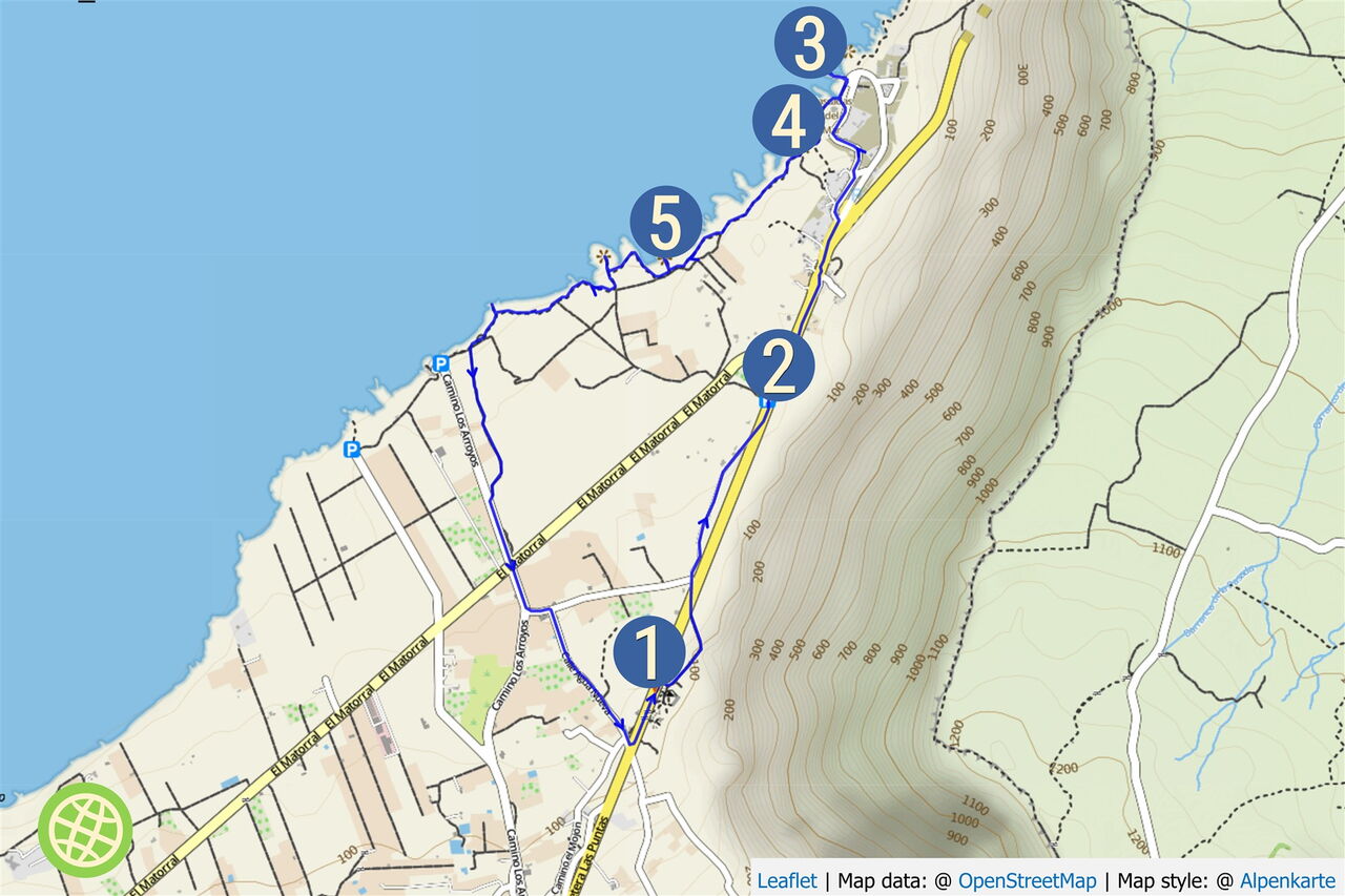 Bei stets eindeutiger Wegführung kommt dieser einfache Küstenspaziergang fast ohne Höhenmeter aus. Art des Weges: 20 % angelegte Wege, 20 % Piste und 60 % Straße. Zusatzausrüstung: keine. Einkehr: zahlreiche Restaurants auf der Strecke. Beste Wanderzeit: ganzjährig. Erlebnis: das Museo Guinea, die Pozo de Los Padrones, das einst kleinste Hotel der Welt und eine Flaniermeile.