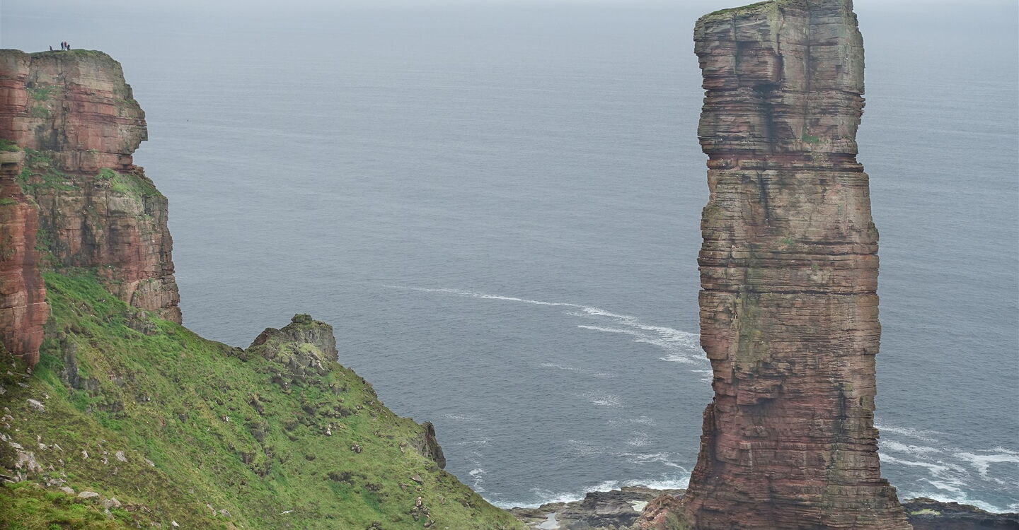 Wir erreichen einen Betonsockel. Ab diesem Messpunkt ist wieder ein schmaler Trampelpfad auszumachen. Bei aufgestellten Steinplatten beginnen wir nun halb rechts mit dem Abstieg über die Almwiesen Schottlands. Wir erreichen den oberen Klippenrand, beim Blick auf das 332 m tiefer gelegene Meer stockt automatisch der Atem. Vor uns thront das 03 St John's Head (332 m), mit 343 m ist es die am steilsten abfallende Klippe Großbritanniens. 1970 wurde sie erstmals bestiegen. Von nun an folgen wir dem Küstenpfad bis zur Laeden Geo. Eine an ihrer engsten Stelle 3–5 m breite Rinne fällt aus 328 m Höhe steil bis zum Meer ab, mittig hat sich dekorativ ein großer Stein verkeilt.