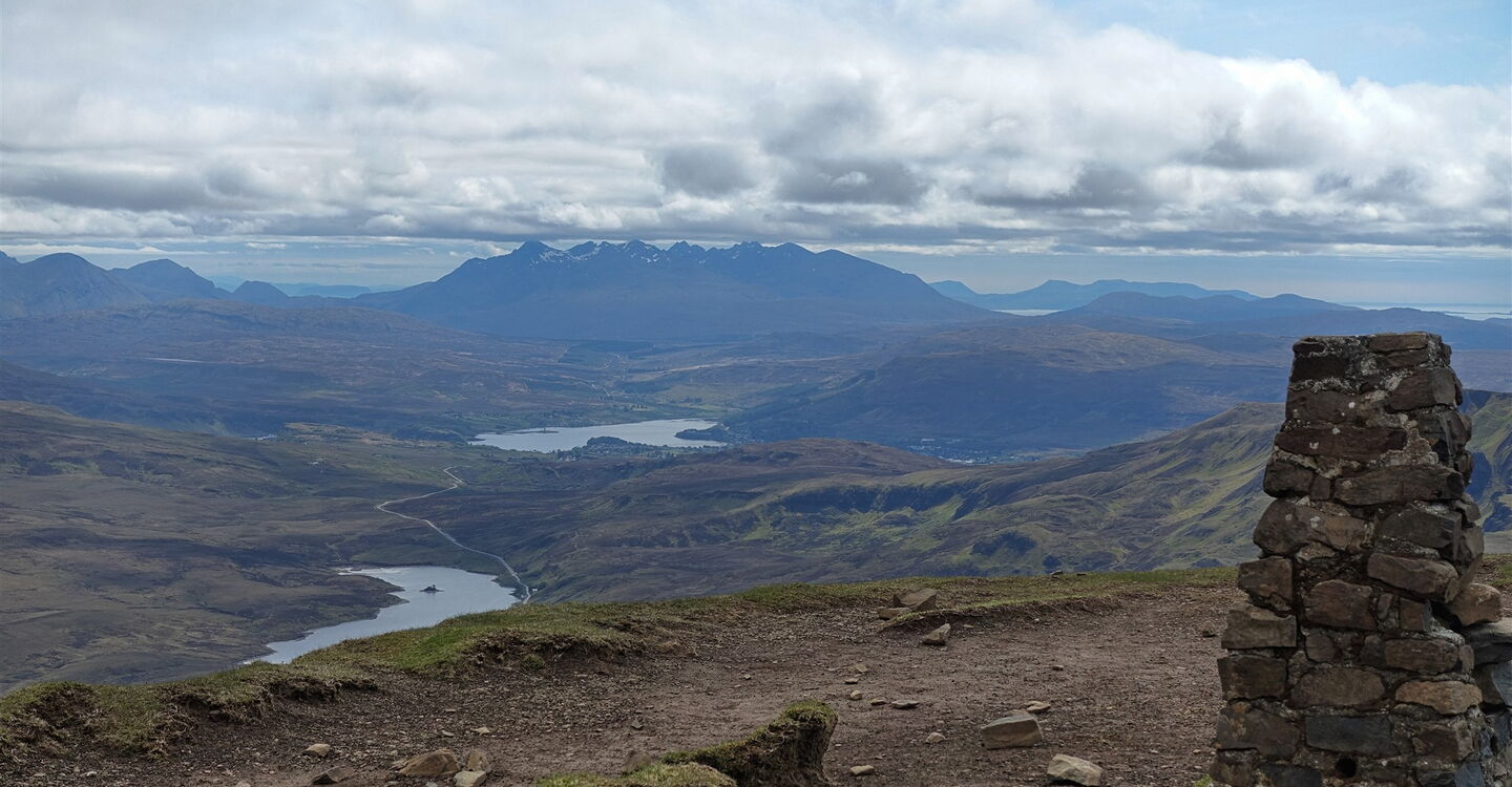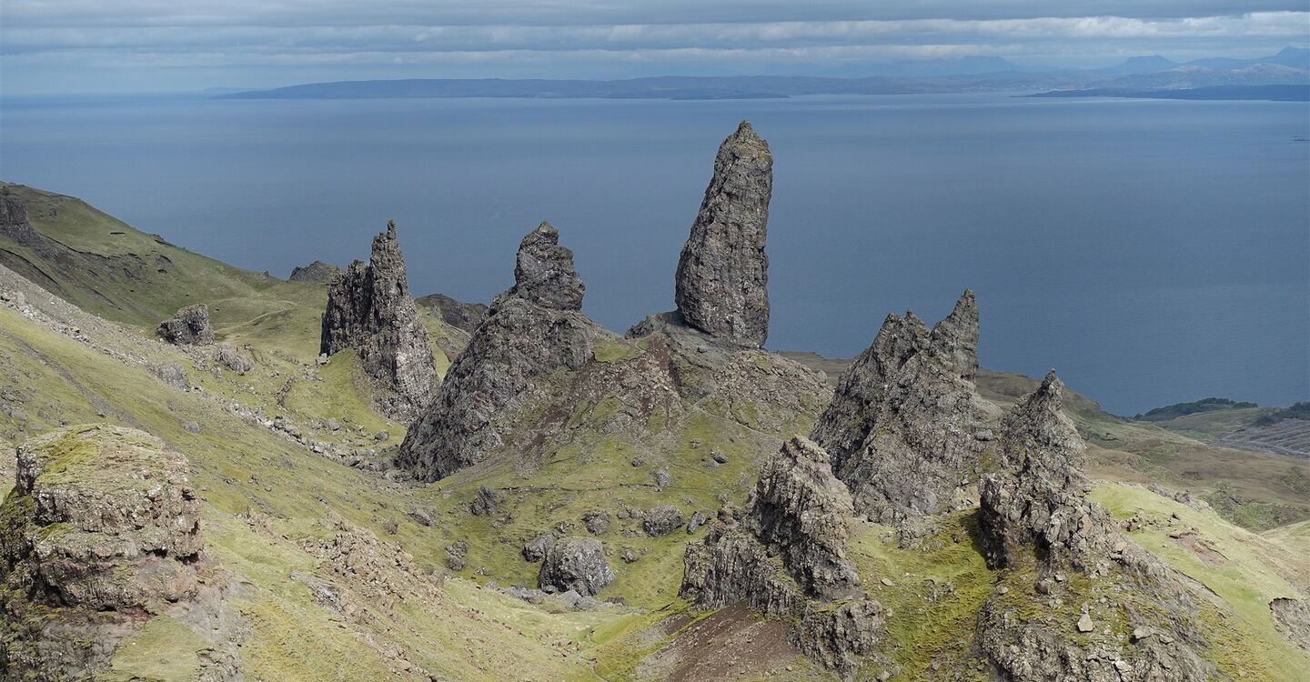 Dieser führt nun spektakulär entlang der Abbruchkante des mächtigen Erdrutschs vor 15.000 Jahren und gewährt faszinierende Tiefblicke auf den Old Man of Storr und seine Kinder. Während sich unterhalb an schönen Tagen die Touristenscharen drängen, steigen wir im Alleingang auf Grashängen bis zum Gipfel des 03 The Storr (719 m) auf. Während die felsige Ostseite des Gipfels gut 300 Höhenmeter senkrecht abfällt, sind das Gipfelplateau sowie seine Ostseite dagegen unspektakulär, leicht abfallend und mit Gras bewachsen. Ja, das Grün ist so kurz gehalten, dass man es als "Englischen Rasen" bezeichnen könnte, wären wir nicht in Schottland.
