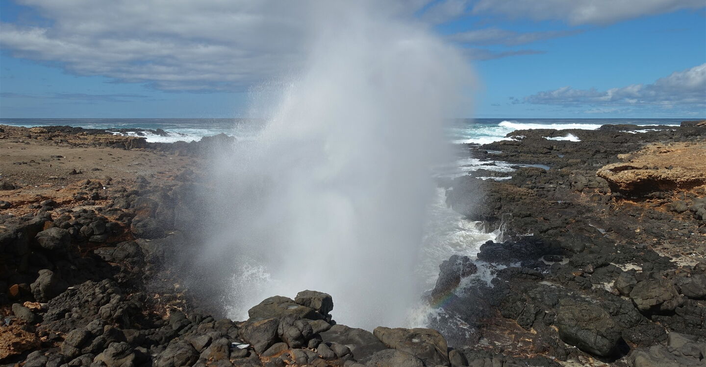 Entlang der Westküste von Sal, mit seinen einzigartigen geologischen Besonderheiten, führt die Wanderung zu einer der interessantesten Sehenswürdigkeiten der Insel. Im Meeresarm von Buracona, deren Felsen aus Basalt sind, befindet sich das Olho Azul. Bei perfekten Bedingungen reflektiert der Lichteinfall des Sonnenlichts, am Meeresgrund der Bucht, in Form eines riesigen blauen Auges. Zu den idealen Voraussetzungen zählen: Mäßiger Wellengang, wenn man um die Mittagszeit an Ort und Stelle ist und die Sonne genügend hoch am Himmel steht. Grüne Algen, die sich angesiedelt haben, und das blaue Auge, stehen im Kontrast zur umliegenden schwarzen Vulkanlandschaft. Auf dem Rückweg marschieren wir durch die karge Savanne, vorbei am Fuße des 269 m hohen Vulkan Monte Leste bis zur Inselhauptstadt Espargos.