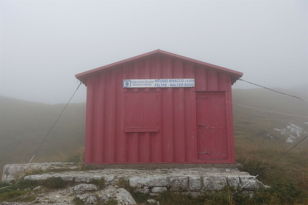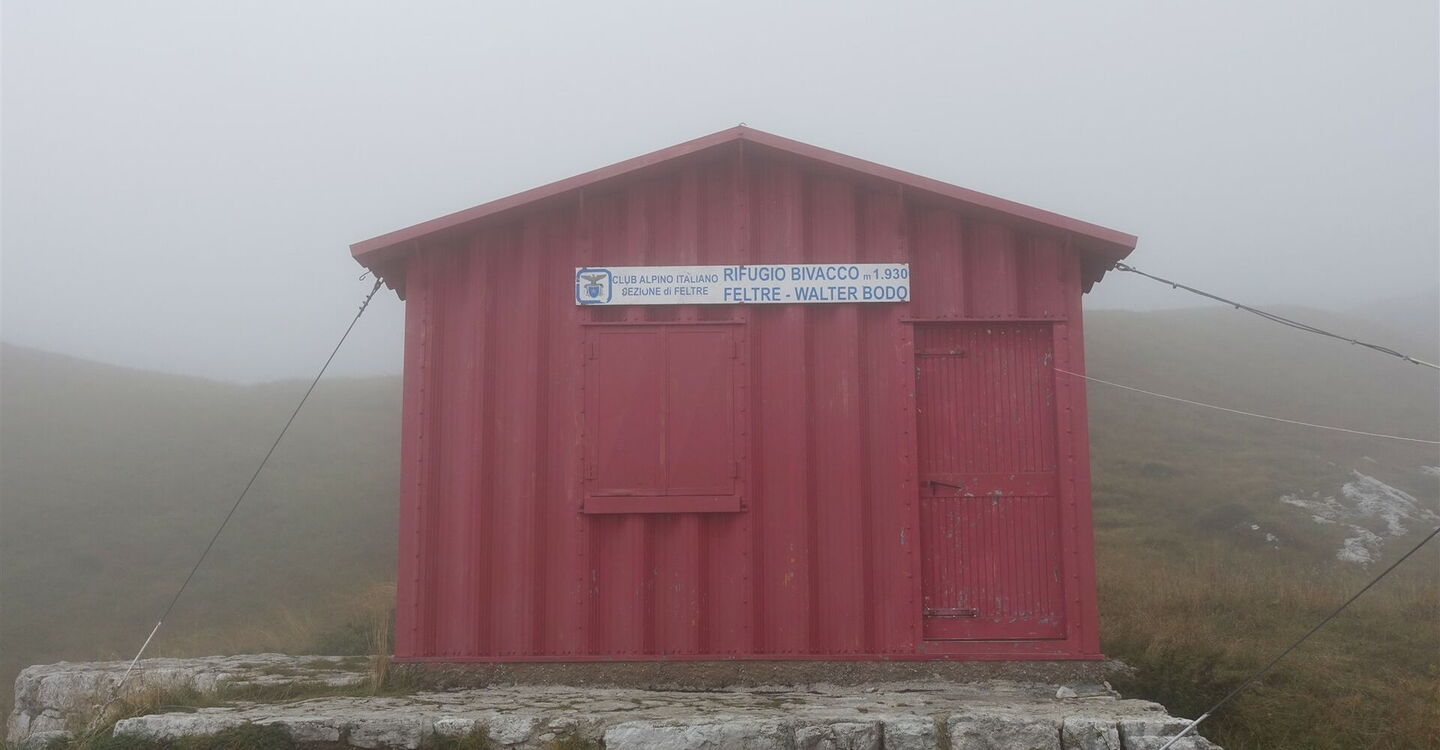Der weitere aussichtsreiche Höhenweg führt zunächst in südwestliche Richtung, bis wir dann durch eine schmale Scharte im Zickzack bis zu mit Gras bewachsenen Hängen absteigen. Nachdem wir mehrere Bachbetten und eine alpine Hochwiese gequert haben, erreichen wir das idyllisch gelegene 05 Bivacco Feltre (1.930 m).