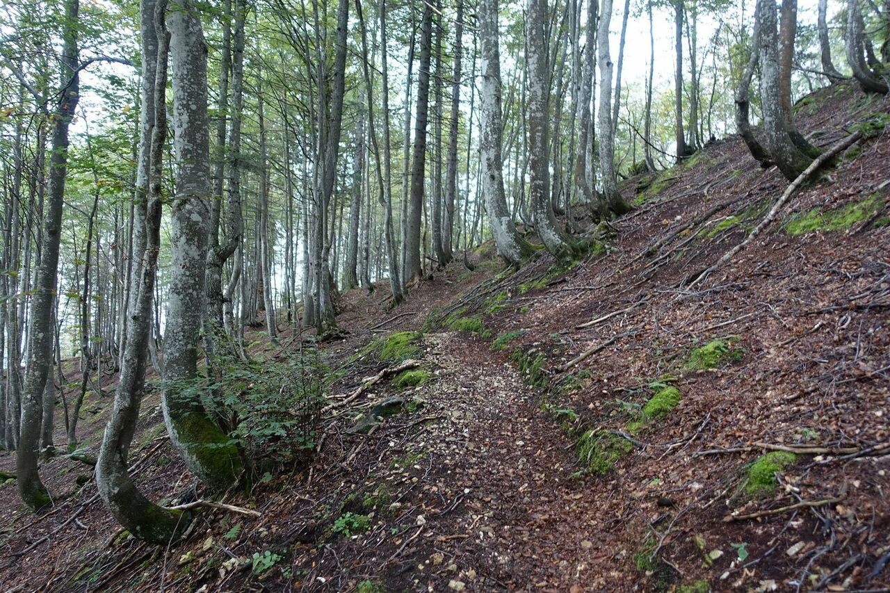 Nach ca. 3,4 km verlassen wir die Piste und wechseln auf einen nach halb rechts abzweigenden Pfad. Es folgt ein schöner Waldweg. Mehrere Bachbetten werden gequert, bis wir den Wegpunkt Colaz (1.365 m) erreichen. An dieser Stelle ignorieren wir den linken 03 Abzweiger (1.379 m) Richtung Rifugio Forestale und gehen rechts auf dem ausgezeichneten Wanderweg 801 weiter.