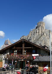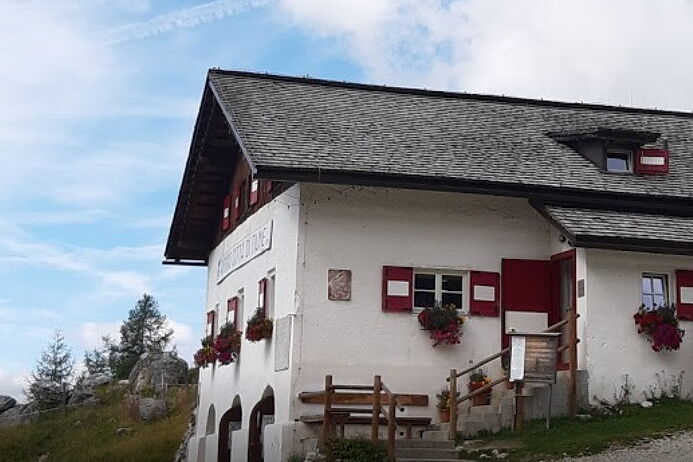Unterhalb der Westhänge des Berges Col de la Puina wandern wir durch lichten Wald auf der Forststraße leicht bergab. Sobald wir unterhalb der Forststraße das 05 Rifugio Città di Fiume (1.918 m) sehen, steigen wir auf dem nachfolgenden Pfad zum Haus ab. Von der Hütte blickt man direkt auf die mächtigen Schutthalden der Nordwestflanke des 3.127 m hohen Monte Pelmo.