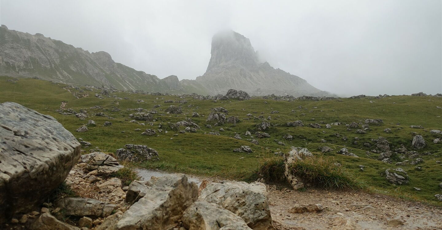 Links führt der Wanderweg 436 bergab zur Malga Giau. Wir gehen nun rechts – ebenfalls der Wanderweg 436 – und erreichen nach steilem Aufstieg die aussichtsreiche 02 Forcella di Giau (2.370 m). Von hier, am Fuße der steilen Südwände des 2.657 m hohen Ponta Lastoi de Formin, schweift unser Blick Richtung Südosten bis zu den mächtigen Felswänden des Monte Pelmo. An der Gabelung mehrerer Pfade gehen wir in östlicher Richtung weiter auf dem Wanderweg 436 Richtung Forcella Ambrizzola. Zunächst navigieren wir im Slalom um riesige Felsen, bis der Weg durch flaches Wiesengelände dann leicht bergab führt. Da der Weg bei Nebel keine Orientierungspunkte bietet, wurden bemalte Holzpflöcke sporadisch aufgestellt. Bei guter Sicht ist die Orientierung kein Problem, denn wir gehen auf die westliche Flanke des mächtigen Felsturms des Becco di Mezzodì zu.