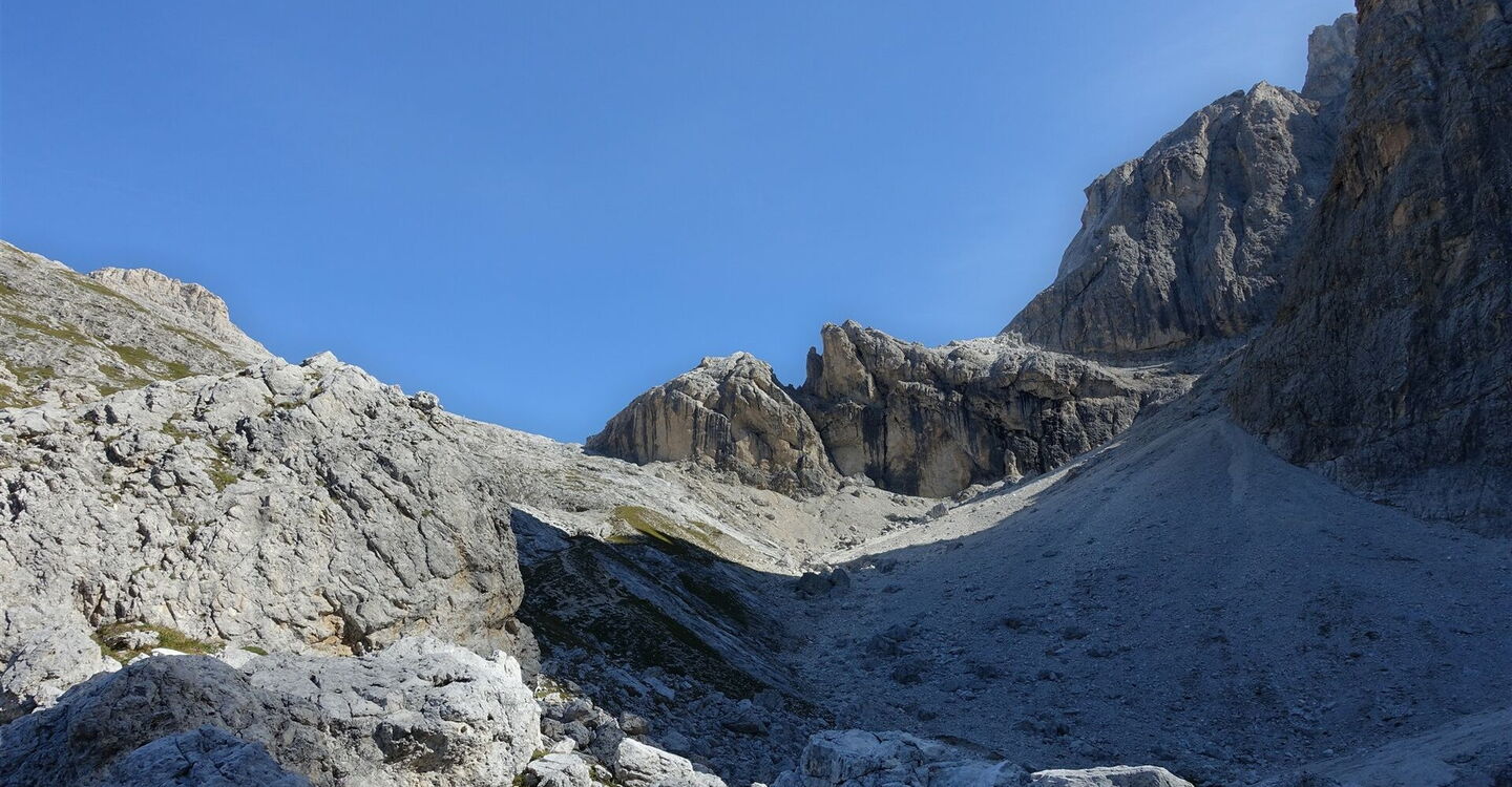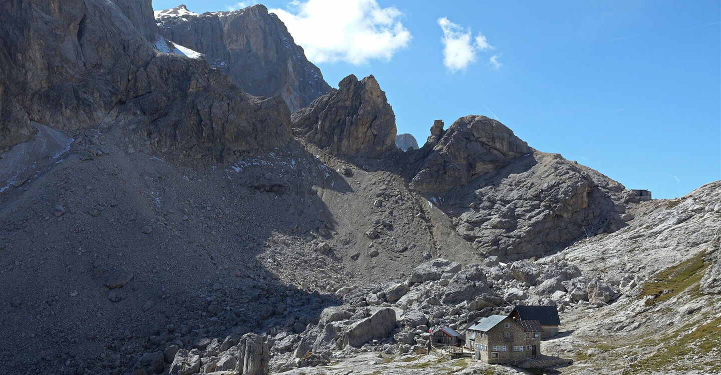 Unter den mächtigen Gipfeln der Pale di San Martino steigen wir dann durch ein breites Tal zum 2.619 m hohen Passo Mulaz auf. Bei guter Sicht kann man bereits unterhalb das 05 Rifugio Mulaz (2.571 m) erkennen, das nach wenigen Metern Abstieg erreicht ist.