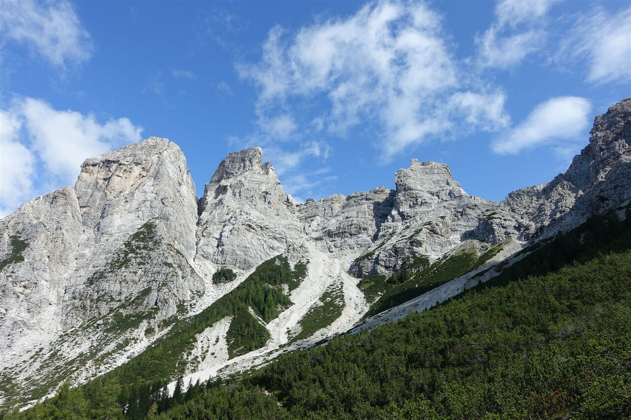 Zwischen Wiesen gelegen, erreichen wir dann die Casa del Moschesin (1.800 m) und einen Brunnen. Von dort gehen wir auf einem mit Latschenkiefern bewachsenen Berghang im Zickzack bergauf. Nach einem ca. 200 m langen und gerade verlaufenden Wegabschnitt erreichen wir den Scheitelpunkt (1.966 m) unserer heutigen Wanderung. Richtung Südosten ergibt sich ein wunderschöner Ausblick auf die drei Gipfel der Cima de Zità, die zur Talvenagruppe gehören. Nach kurzem Abstieg erreichen wir die 04 Forcella Moschesin (1.938 m).