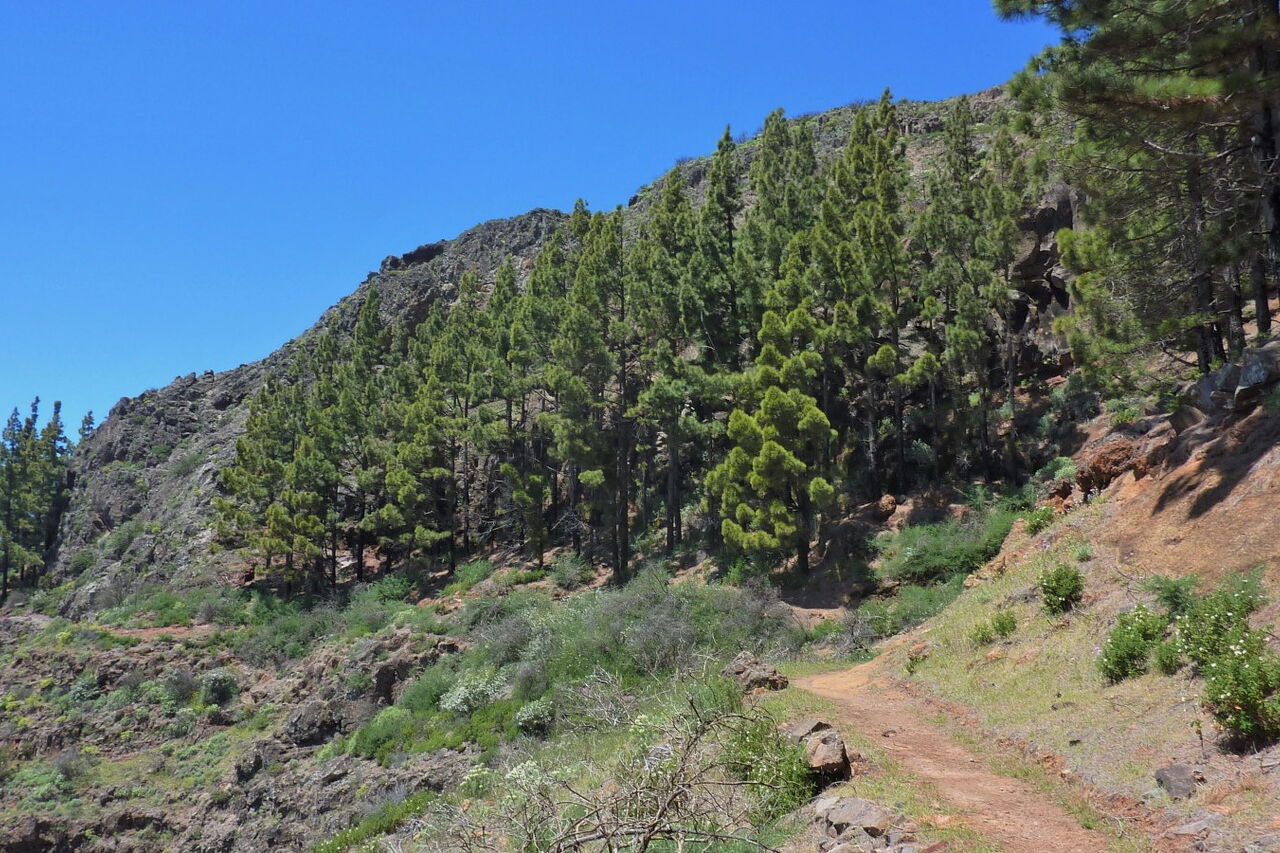 Der Wanderweg führt unterhalb von prachtvollen Kanarenkiefern bis zur (05) Asphaltstraße (1145 m), an der wir links bergauf gehen und diese in einer Rechtskehre nach links verlassen. Wir wandern nun direkt auf die Fortaleza de Chipude zu und treffen wieder auf den Hinweg.