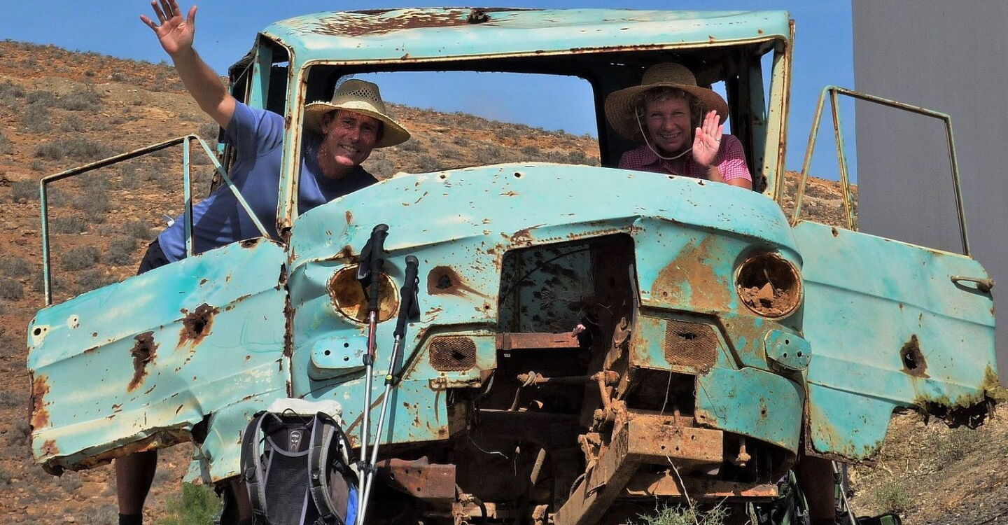 Der Abstieg erfolgt Richtung Norden über die Steinmauer. Wir gehen rechts in nordwestlicher Richtung an dieser Mauer entlang und halten uns nach 220 m halb links, um nicht in das rechts von uns liegende Barranco zu geraten. Auf diesem weglosen Stück halten wir uns immer in 30-50 m Entfernung vom Barranco. Schon bald sehen wir auf der rechten Seite Terrassenfelder. In der Verlängerung der gedachten Achse beginnt eine Schotterpiste, auf der wir weiter taleinwärts laufen. Auf diesem Weg erreichen wir Betancuria. Lohnend ist der Abstecher rechts herunter zu einem Friedhof und einem sehr originellen (05) Schrottwagen (439 m), der zu lustigen Fotomotiven einlädt.