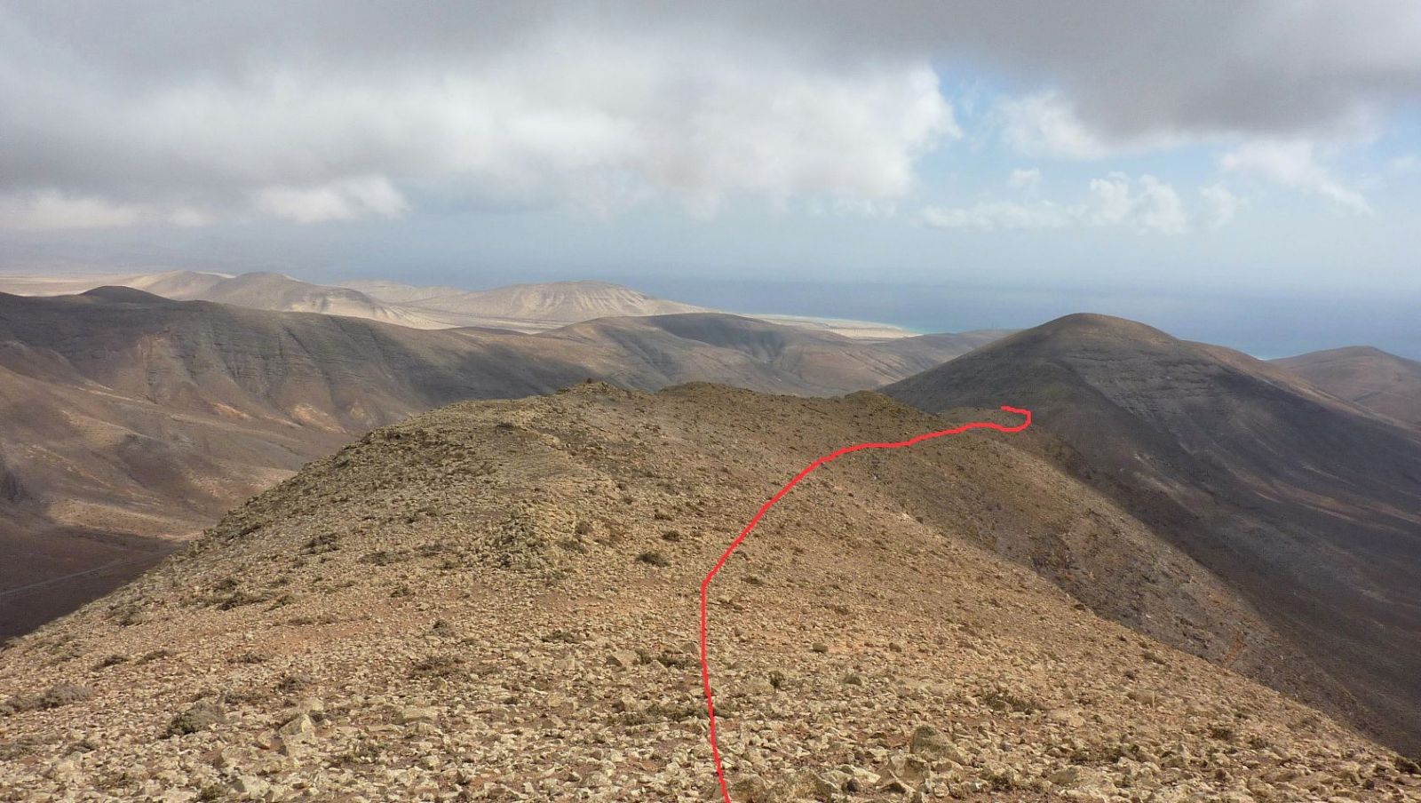 Wenn es denn mal auf Fuerteventura regnet, so prasselt der Regen mit solcher Gewalt über die Insel, dass sich die Trockenflussbetten – der Spanier sagt Barrancos – mit Wasser füllen, das alles mitreißt, was im Weg steht. So bildeten sich über Jahrmillionen diese radial angeordneten Erosionsrisse – zugleich wunderbare Wanderwege. Außerdem hat diese Erosion die Berge so weit abgetragen, dass kilometerlange, seicht abfallende Bergrücken entstanden. Durch und über diese Naturgegebenheiten führt heute die Wanderung zu einem unbekannten Gipfel. Sehr beeindruckend ist auch die Fernsicht über die Gipfelgruppe des Jandia-Bergmassivs. Zu seinen Füßen brechen die meterhohen Wellen des Atlantischen Ozeans – mit tosendem Lärm – an dem wunderschönen, 14 km langen Sandstrand Playa Satovento.