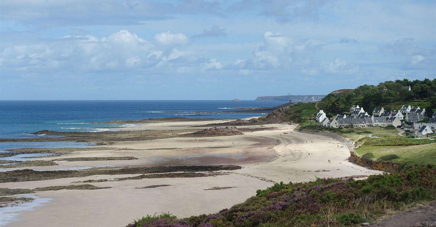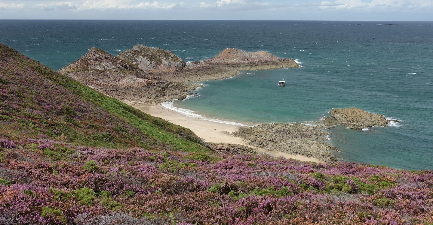 Über einen seichten Bergrücken erreichen wir die 04 Pointe des Quatre Vents (53 m) – ein faszinierender Aussichtspunkt. Durch die Ginster- und Heidelandschaft gehen wir auf einem der vielen Pfade in Richtung eines Parkplatzes. 50 m vor einem Steinhaus verlassen wir die Straße nach rechts auf einen Pfad. Wir wandern nun in Richtung eines weiteren Steinhauses. Der Pfad mündet kurz später in einen breiteren Pfad, dem wir nach halb rechts folgen. Nach 20 m gehen wir abermals halb rechts, um dann vor dem Gebäude auf dem links bergab führenden und etwas gerölligen Pfad abzusteigen – die technisch schwierigste Stelle der Wanderung.