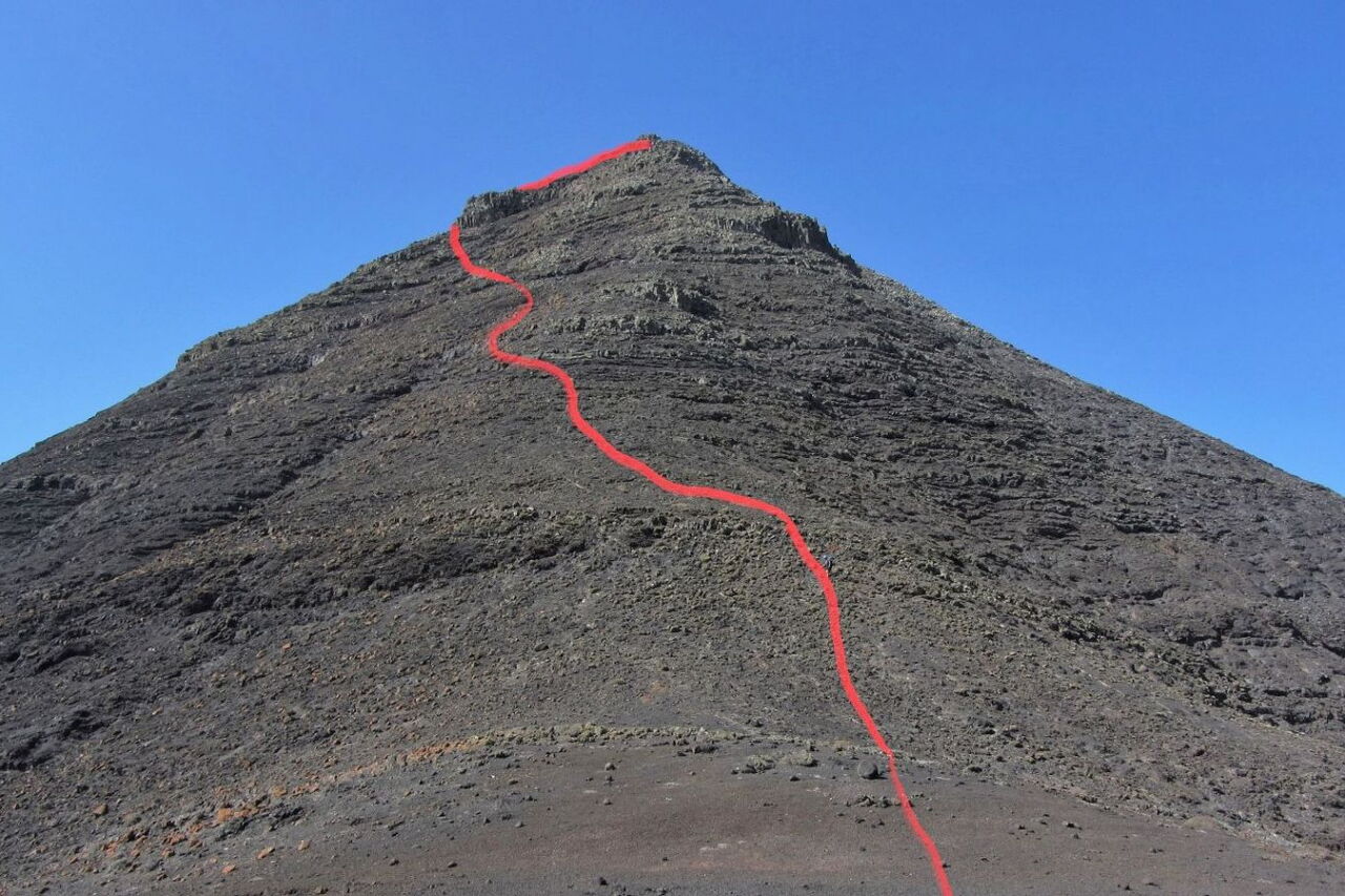 Direkt hinter dem (01) Start und Ziel (250 m), dem Mirador Degollada de Agua Oveja, erhebt sich in westliche Richtung der Pico las Pilas. Zunächst gehen wir auf dem seichten Bergrücken, bis wir am Fuße der Pyramide angekommen sind. Da das Gelände sehr steil und rutschig ist, lässt es sich in einem der vielen Barrancos besser aufsteigen.
