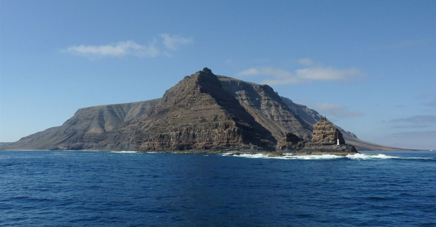 Es folgt ein landschaftlich sehr schöner Weg. Auf der rechten Seite sieht man die Nordspitze von Lanzarote mit den steil abfallenden Klippen des Famara Gebirgsmassivs. Links auf La Graciosa sind die 04 beiden Vulkane 3 m Agujas Grandes (267 m) und Agujas Chicas (257 m) zu sehen.