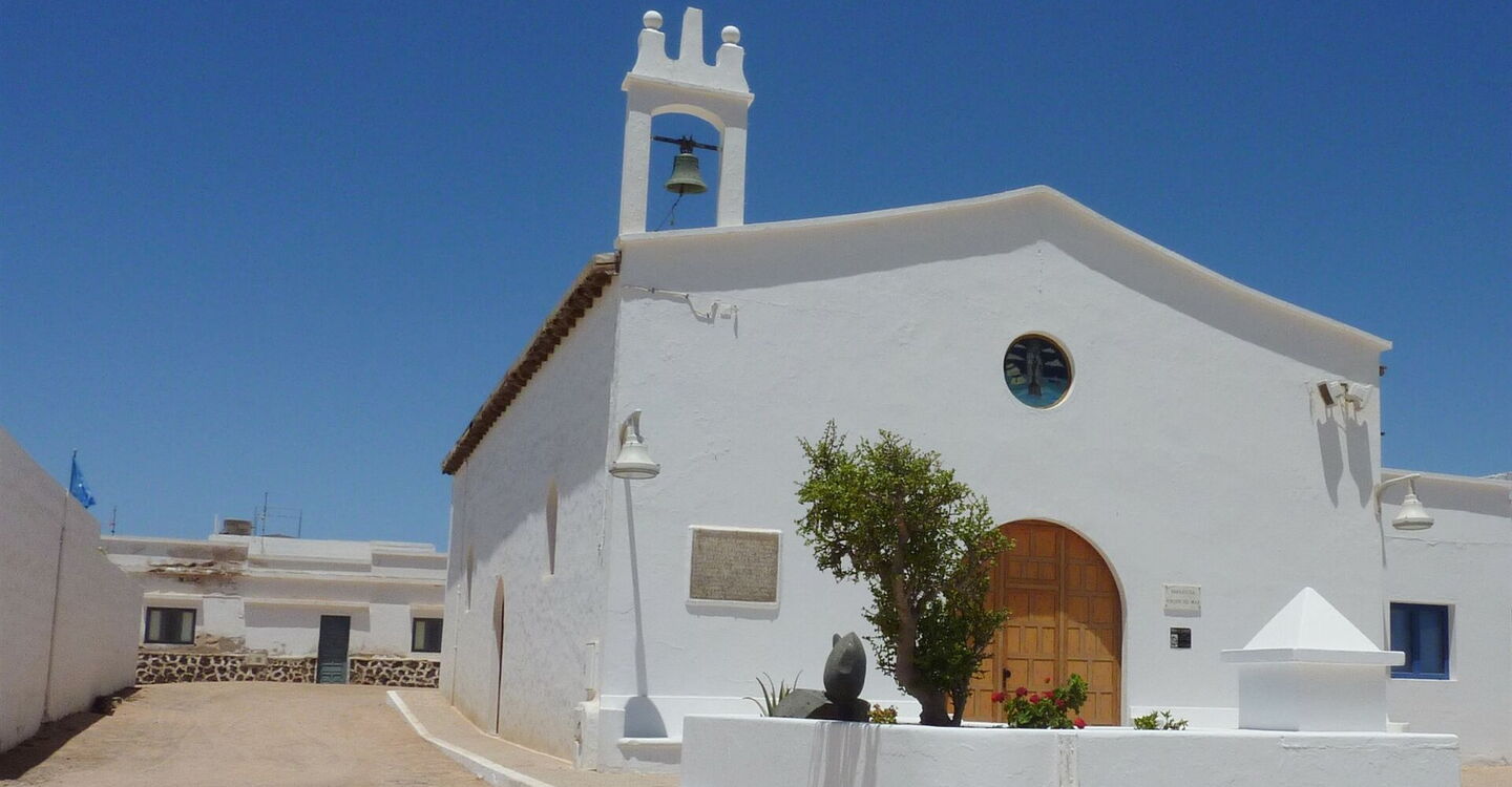 Nach 50 m führt der Weg halb rechts an dem mittig in der Straße stehenden Haus vorbei. Wir treffen auf die schlicht gehaltene weiße Dorfkirche 02 La Virgen del Mar 3 m mit ihrem minimalistischen Glockenturm. Im Inneren der Kirche gibt es eine Besonderheit, ein Taufbecken aus einem Schildkrötenpanzer. Wir befinden uns nun auf der Calle Gracia Escámez und gehen in nordöstlicher Richtung, bis wir uns bei einem kleinen Platz mit Palmen halb rechts halten und in die Calle el Bajio einbiegen. Am Ende der Straße gehen wir direkt auf ein Gebäude zu, an dem wir uns links halten, um direkt ans Meer zu gelangen.