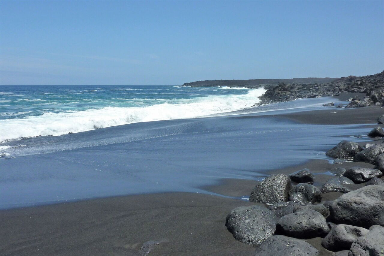 Es erwartet uns eine spannende Pkw-Fahrt durch eine lebensunfreundliche Lavalandschaft, gefolgt von einer erlebnisreichen Wanderung zu einem Traumstrand. Art des Weges: Anfahrt auf einer Schotterpiste. Die kurze Wanderung geht über Sand und Felsen. Ein Strand, der zum Verweilen einlädt! Daher sollte folgende Ausrüstung nicht fehlen: Sonnenhut, Sonnencreme, Sonnensegel, Essen und Trinken. Einkehr: Es gibt weit und breit keine Einkehrmöglichkeit. Beste Zeit für diese Tour: Das ganze Jahr über. Auf der linken Seite des Strandabschnitts erhebt sich eine 5-7 m hohe Felswand, an der sich die Wellen spektakulär brechen. Direkt vorgelagert befindet sich ein natürliches Wasserbecken, in dem man sich abkühlen kann.