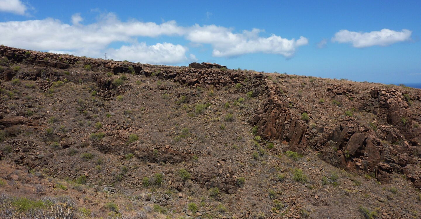 Am (01) Playa del Medio (5 m) verlässt am linken hinteren Ende des Parkplatzes ein steil aufsteigender Pfad die Bucht in östliche Richtung. Wir überschreiten die Punta del Joradillo und nach einem kurzen Abstieg erreichen wir den Playa de Chiriguarime. An seinem westlichen Ende gibt es einige sandige Stellen. Wir queren den Strand zu seinem östlichen Ende und gehen direkt auf eine kleine Ruine zu. Hinter dieser beginnt ein steil aufsteigender Pfad, der durch vereinzelte hellblaue Punkte markiert wurde. Auf dem Bergrücken angekommen, wandern wir kurzfristig auf dem oberen von zwei Küstenpfaden, orientieren uns dann aber im weiteren Verlauf an Steinmännchen.