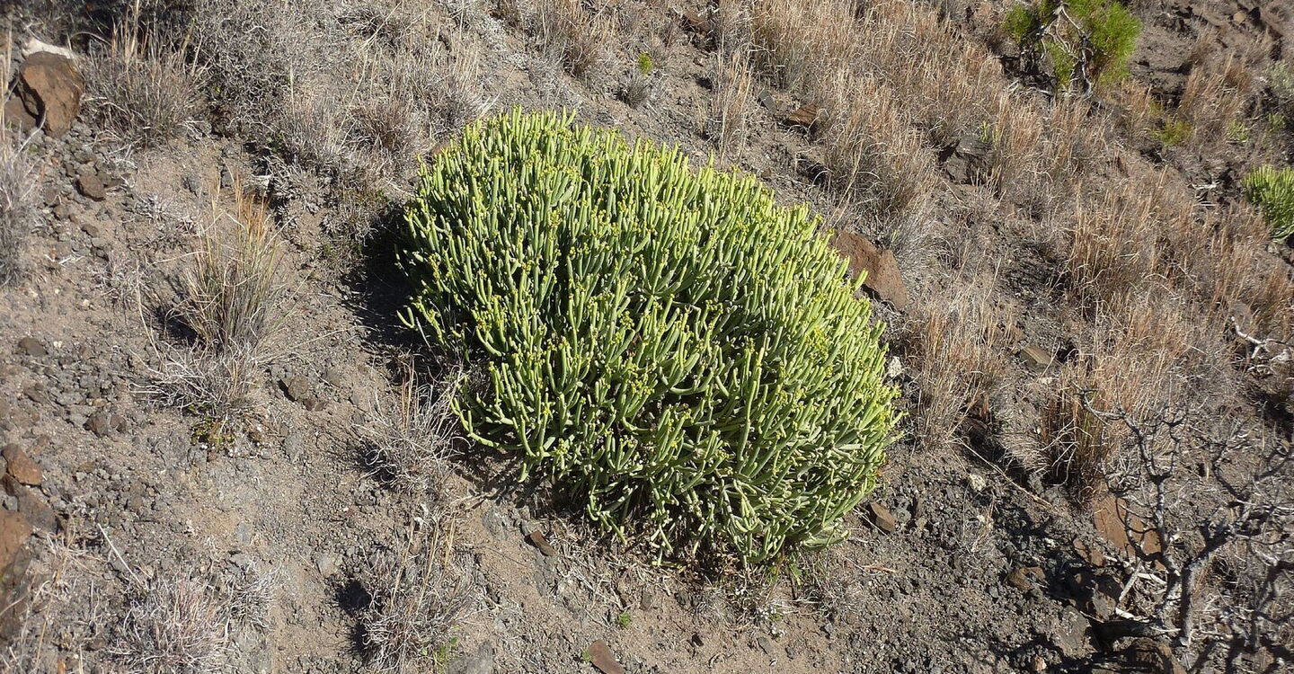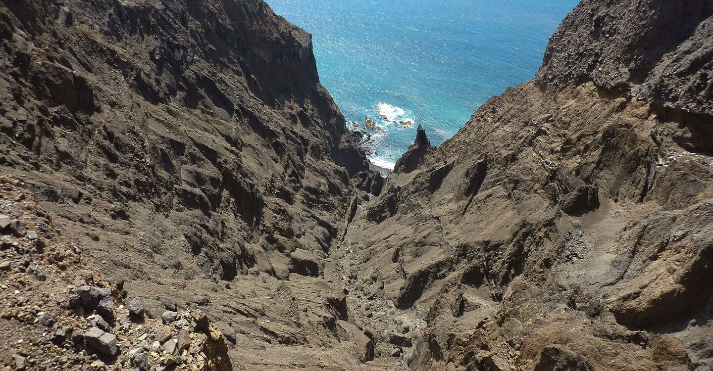 Nach Überschreitung der Einsattelung sieht man tief unterhalb das Meer. Wir queren den Hang nach halb rechts, um auf einen markanten Bergrücken zu gelangen, der sich Richtung Meer bergab schlängelt. Das nachfolgende Stück ist komplett weglos. Das Gelände ist steile, der Untergrund geröllig und rutschig, vorbei kommen wir an wenigen blattlosen Wolfsmilchgesellschaften. Nach 200 m beginnen (02) Abstieg (264 m) in das 60 m tiefer gelegene Barranco, dem wir weiter bergab folgen. Als Variante kann man auch noch weitere 185 m auf dem ursprünglichen Bergrücken bergab gehen, um dort halb rechts auf einem weiteren bergab führenden Bergrücken den Abstieg fortzusetzen.