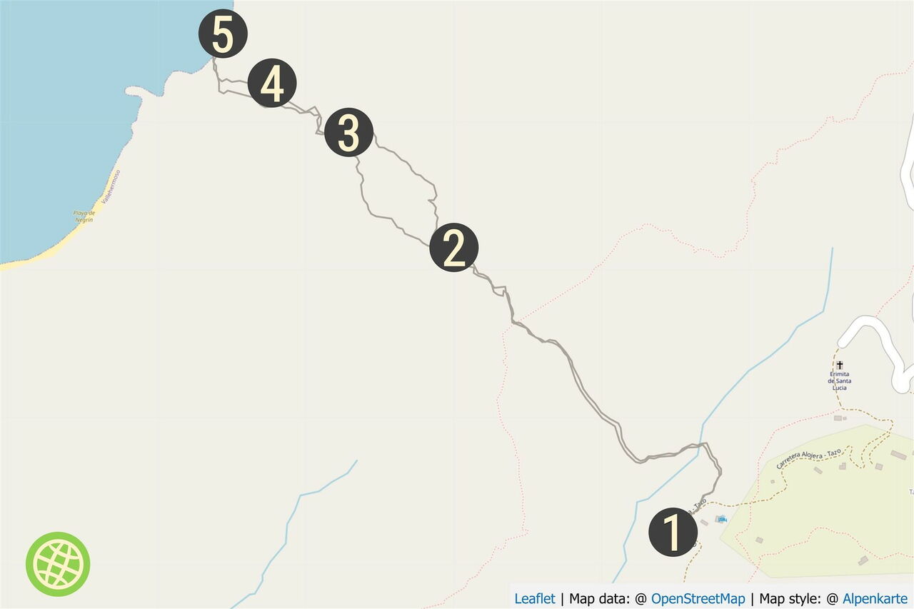 Busanbindung: keine. Pkw Anfahrt: Von Vallehermoso fahren wir auf der GM-1 zunächst Richtung Valle Gran Rey, bis wir rechts Richtung Alojera auf die CV-16 abbiegen. Nach bereits 700 m biegen wir rechts Richtung Tazo und Arguamul ab. Nach einem längeren Stück auf einer Piste zweigen wir dann links Richtung der Streusiedlung von Tazo ab. Dort angekommen fahren wir direkt an der kleinen Kirche vorbei, ignorieren alle Abzweiger nach links, um hinter dem letzten Haus, rechts befindet sich eine kleine Schlucht, in der Linkskehre bei einer kleinen Parkbucht zu parken. Geokoordinaten Parkplatz: 28.18395 -17.313017.