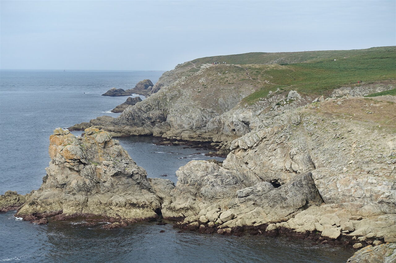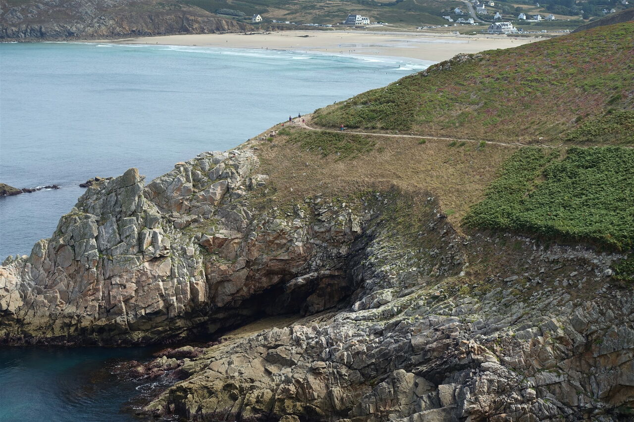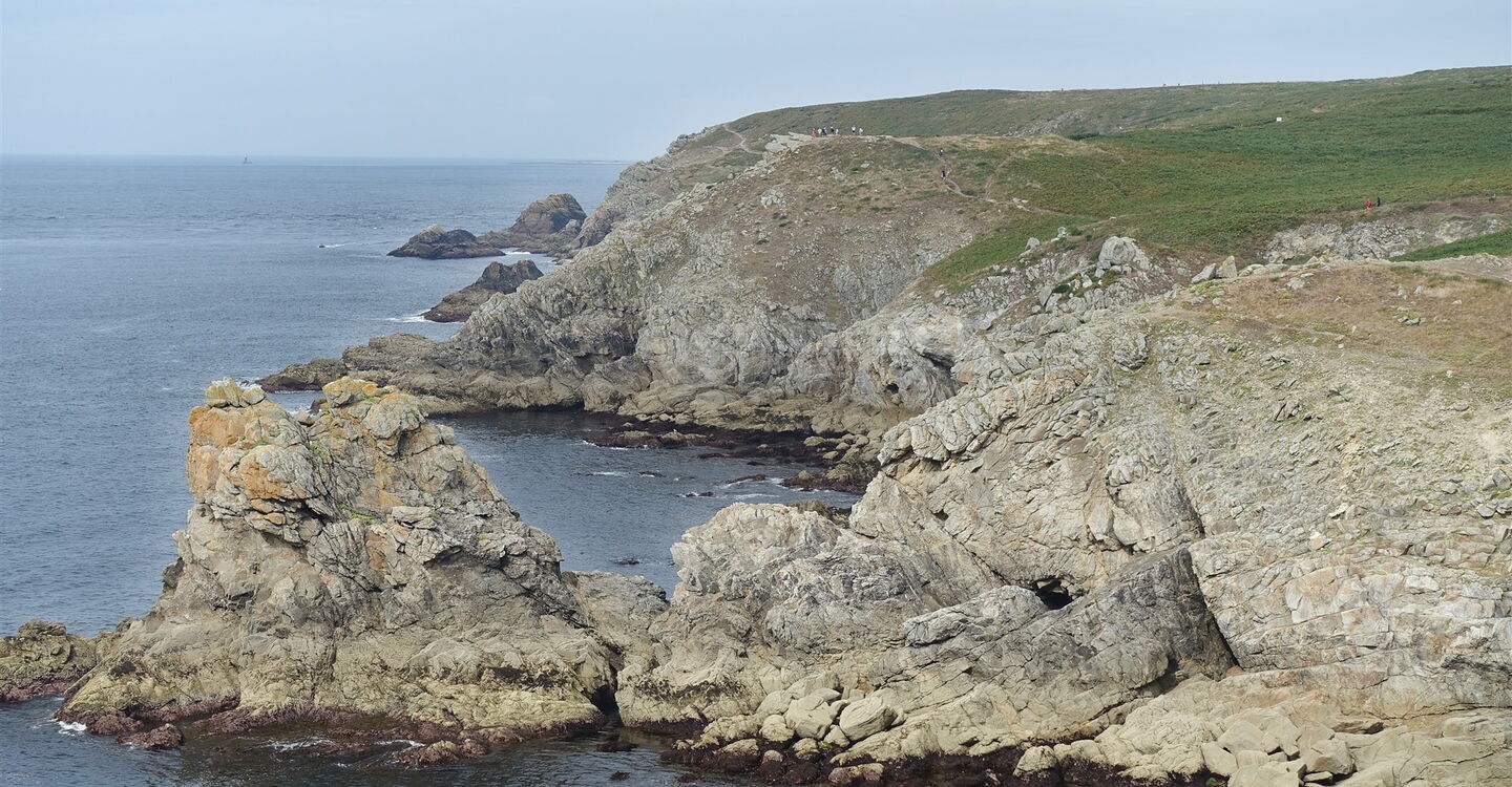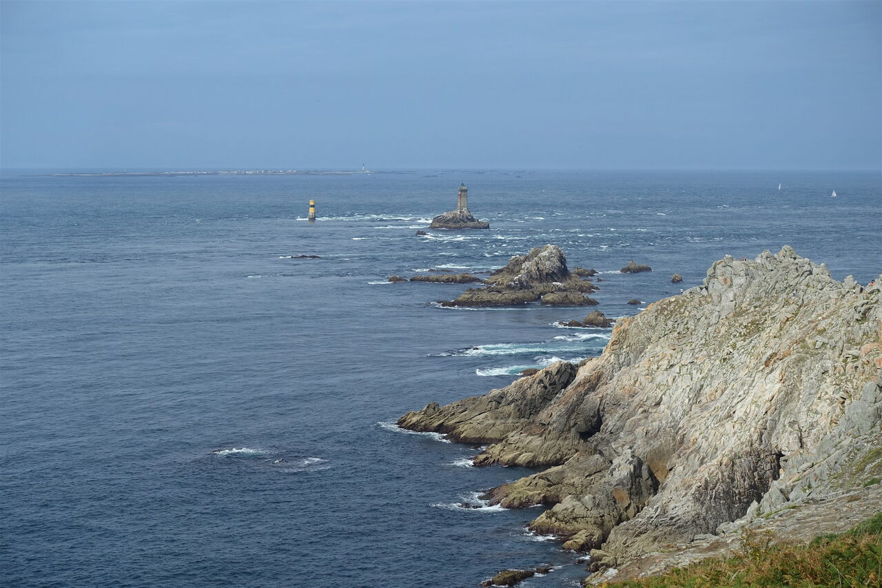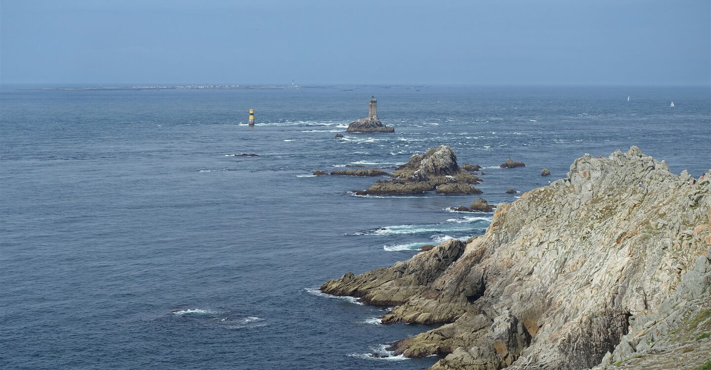 Bei der Landspitze 04 Pointe du Raz (63 m) ist das Panorama unvergleichlich: Man schaut über das aufgrund der kräftigen Gezeitenströmungen und oft hohen Wellen quirlige Gewässer des Raz de Sein bis zur Isle of Sein. Dazwischen befinden sich die Leuchttürme Phare de la Vieille – direkt der Küste vorgelagert – und Phare de Tévenne – halb rechts in 5 km Entfernung. Hinter der 7 km entfernten Insel Sein erhebt sich der berühmte Leuchtturm Ar Men am Horizont, der bekannteste und am weitesten von der Küste entfernte Leuchtturm Frankreichs. Er markiert die Einfahrt der Sein-Passage.