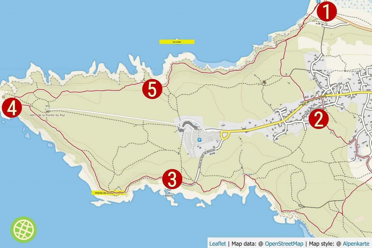 Am Start und Ziel am Parkplatz gehen wir links vom Restaurant in Richtung Meer und 01 Baie des Trépassés (11 m). Kurz vor dem Ufer gehen wir links auf einem Pfad auf einen Bunker zu, um dort über Treppen auf die Klippen zu gelangen. Bei einer ersten Weggabelung gehen wir noch oberhalb des Strandabschnitts weiter. An der nachfolgenden Stelle, wo sich ein Zaun befindet, zweigt nach links ein schmaler Pfad durch Farne ab. Hinter einer Steinmauer ignorieren wir den rechten Abzweiger und gehen weiter auf die Anhöhe zu. Ein weiterer rechter Abzweiger wird ignoriert. Bei einer Kreuzung mehrerer Wege gehen wir links an einem hellblauen Tor vorbei, um nach 10 m rechts den Weg durch die Farne zu nehmen und in Richtung der dahinter liegenden Häuser zu gehen.