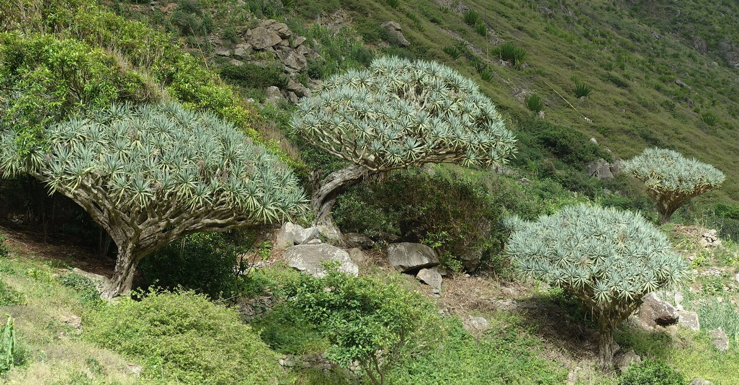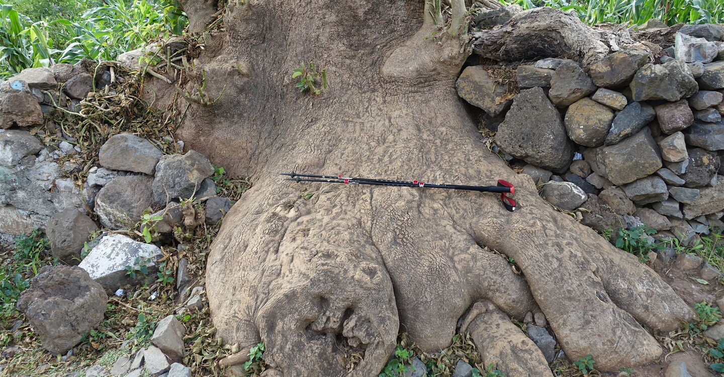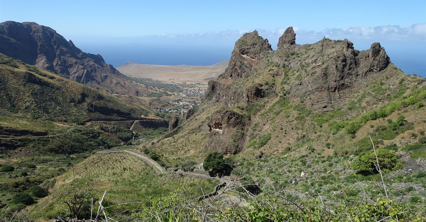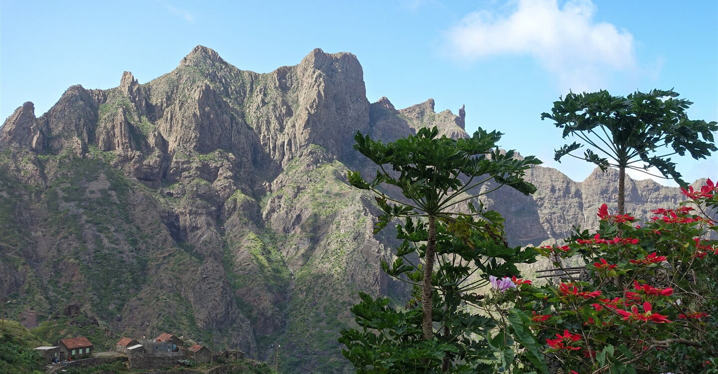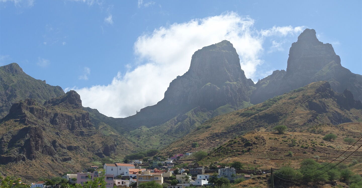 Die Tour beginnt gleich mit einem spektakulären Auftakt, vor uns erheben sich die Felstürme des 1057 m hohen Tope Matin und des 954 m hohen Tope Moca. Auf einem uralten und größtenteils gepflasterten Caminho, führt die Wanderung durch das zerklüftete Hauptbergmassiv der Insel São Nicolau. Besonders eindrucksvoll ist die Streckenführung unterhalb der 400 m steil aufragenden Felswand des Tope Matin. Die gesamte Bergregion wurde kultiviert, überall befinden sich Terrassenfelder, Häuser wurden waghalsig auf Felsvorsprüngen gebaut. Wir laufen dort, wo auch heute noch Maultiere den Transport leisten. Aufgrund der Höhenstufung passieren wir verschiedene Vegetationszonen, von der trockenen Savanne bis zu den satt grünen Hochebenen. Zu den Höhepunkten zählen die zahlreichen Drachenbäume. Klare Bergluft erfrischt den Geist und belebt die Sinne.