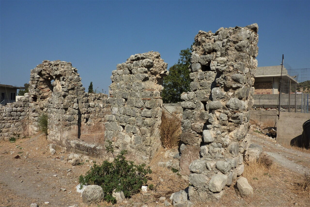An dieser 02 Schlüsselstelle (136 m) gehen wir links am Reservoir und Schilfgras vorbei, dann im Bachbett 10 m rechts, um an geeigneter Stelle den Bach auf die andere Uferseite zu verlassen. Zwischen den Weinstöcken führt ein Wirtschaftsweg bergauf, den wir begehen, bis dieser endet und wir rechts an einem weiteren Wasserreservoir vorbeikommen. Wir ignorieren 3 rechte Abzweiger und gehen durch eine Links- und eine Rechtskehre, nun direkt auf die Kirche des Dorfes Kiparissos zu. Auf der Asphaltstraße verlassen wir das Dorf in Richtung Westen und der Ortschaft Pirgos, wo wir bei den Ruinen rechts hinunter einen Abkürzer zur unterhalb liegenden Asphaltstraße nehmen.