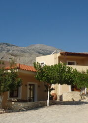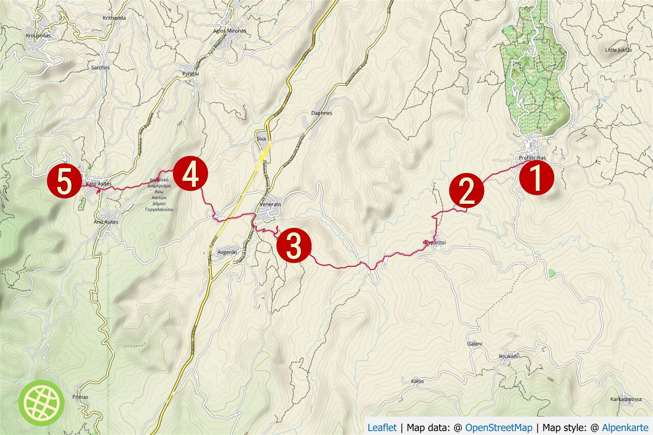 Nach 500 m gehen wir an der Weggabelung geradeaus weiter. Es folgen ein betonierter Weg und eine Wasserpumpstation, bevor der Weg endet. An der querenden Piste gehen wir links und nach 80 m rechts. Nun geht es auf direktem Wege hinunter in die Ortschaft 05 Ano Asites (531 m). Wir queren die Hauptstraße und gehen bei dem kleinen Platz mit Baum halb rechts in die Gasse, die bergauf bis zur Unterkunft führt. Tipp: Geht man bei diesem kleinen Platz links zum Minimarkt und in die daneben liegende Seitenstraße, so erreicht man die Überreste eines ehemaligen römischen Bades.