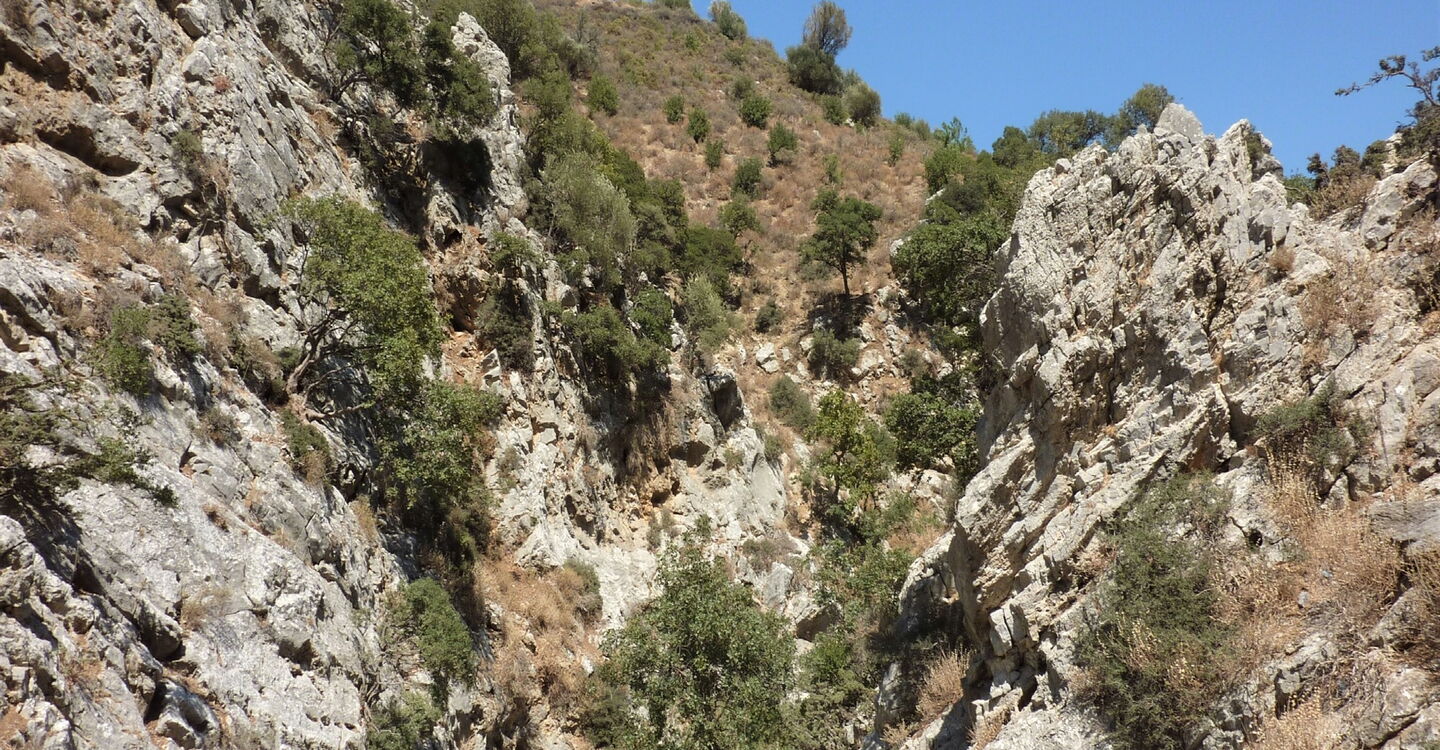 Hier gehen wir links und im weiteren Verlauf erreichen wir hinter der Unterführung den kleinen Dorfplatz von Kerasia. Dort biegen wir bei der Taverne halb rechts in die kleine Gasse ein. Auf der asphaltierten Straße gehen wir geradeaus weiter, um bei der nächsten Weggabelung links zu gehen. Wir gelangen auf die Felder, bei der darauffolgenden Weggabelung gehen wir links und nach 100 m durch die Rechtskehre vorbei an 2 Häusern, bis wir die 04 Schlucht Agios Antonios (292 m) erreichen. Hier gehen wir noch durch das Trockenflussbett und auf das links stehende Gebäude zu. Hinter diesem beginnt eine Piste bergauf, die im weiteren Verlauf durch drei Ziegengatter führt.