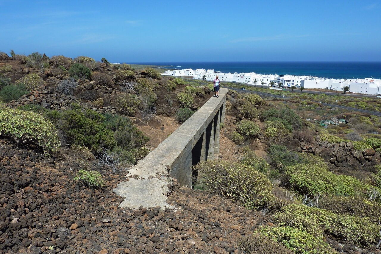 Wir passieren den Durchbruch einer Steinmauer, die sich genau auf Höhe der ersten Häuser (05) oberhalb von Punta Mujeres (18 m) befindet. Es folgt ein diffuser Wegabschnitt, da immer wieder weglose Stücke die Orientierung erschweren. Der Weg führt zunächst leicht bergab, um sich kurz danach rechts an einer Steinmauer gleich wieder bergauf fortzusetzen. Der Weg verläuft sich, wir halten uns links und gehen vorbei an einigen Feldern auf eine Anhöhe zu. Am höchsten Punkt sieht man ein Beton-Viadukt, das wir in Richtung einer Schotterstraße überqueren, die uns links zum Ausgangspunkt zurückbringt.
