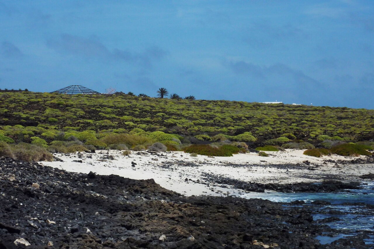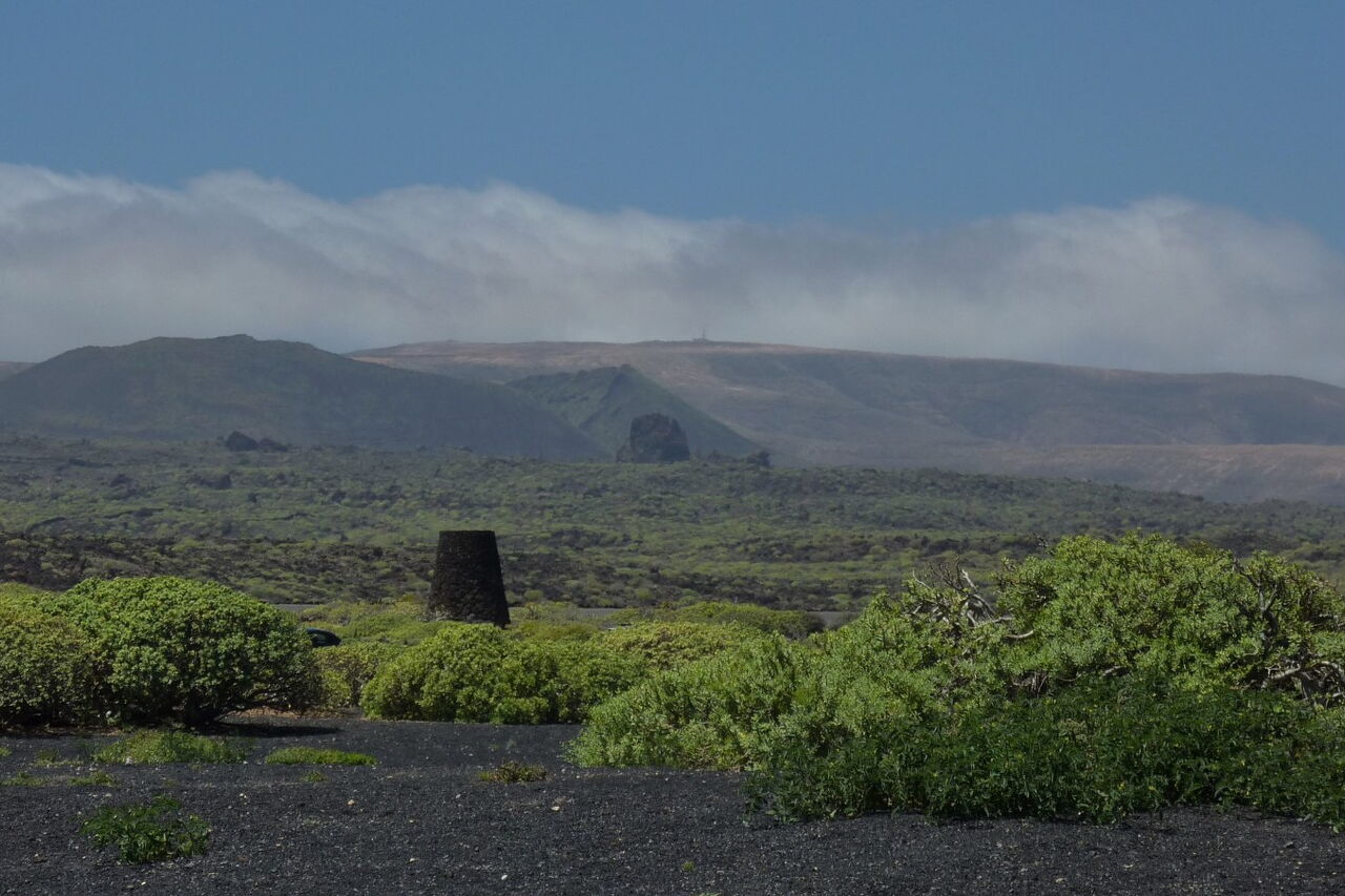 20 m hinter dem rechts von uns liegenden Parkplatz zu den (04) Cueva de los Verdes (55 m) zweigt links eine Asphaltstraße ab - diese ist für Autos gesperrt. Nach 120 m macht die Asphaltstraße eine 90°-Linkskehre und führt zu einem Gebäude, an dem wir bereits in 50 m Entfernung vorbeigegangen sind. In dieser 90°-Kehre verlassen wir die Asphaltstraße, gehen nun auf einem kaum erkennbaren Pfad - eigentlich ist die Beschreibung weglos treffender -, in Verlängerung der Asphaltstraße, geradeaus in südöstlicher Richtung. Als weitere Orientierungspunkte findet man nun immer wieder kleine Betonsockel, aus denen abgeschnittene und verrostete Metallrohre herausstehen. Kurz später treffen wir auf einen breiteren Weg. Wir gehen nun parallel zur LZ-1. Nach 900 m befinden wir uns auf Höhe einer Ruine, die rechts oberhalb von uns steht.