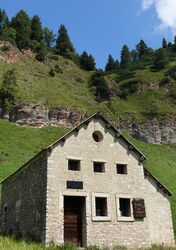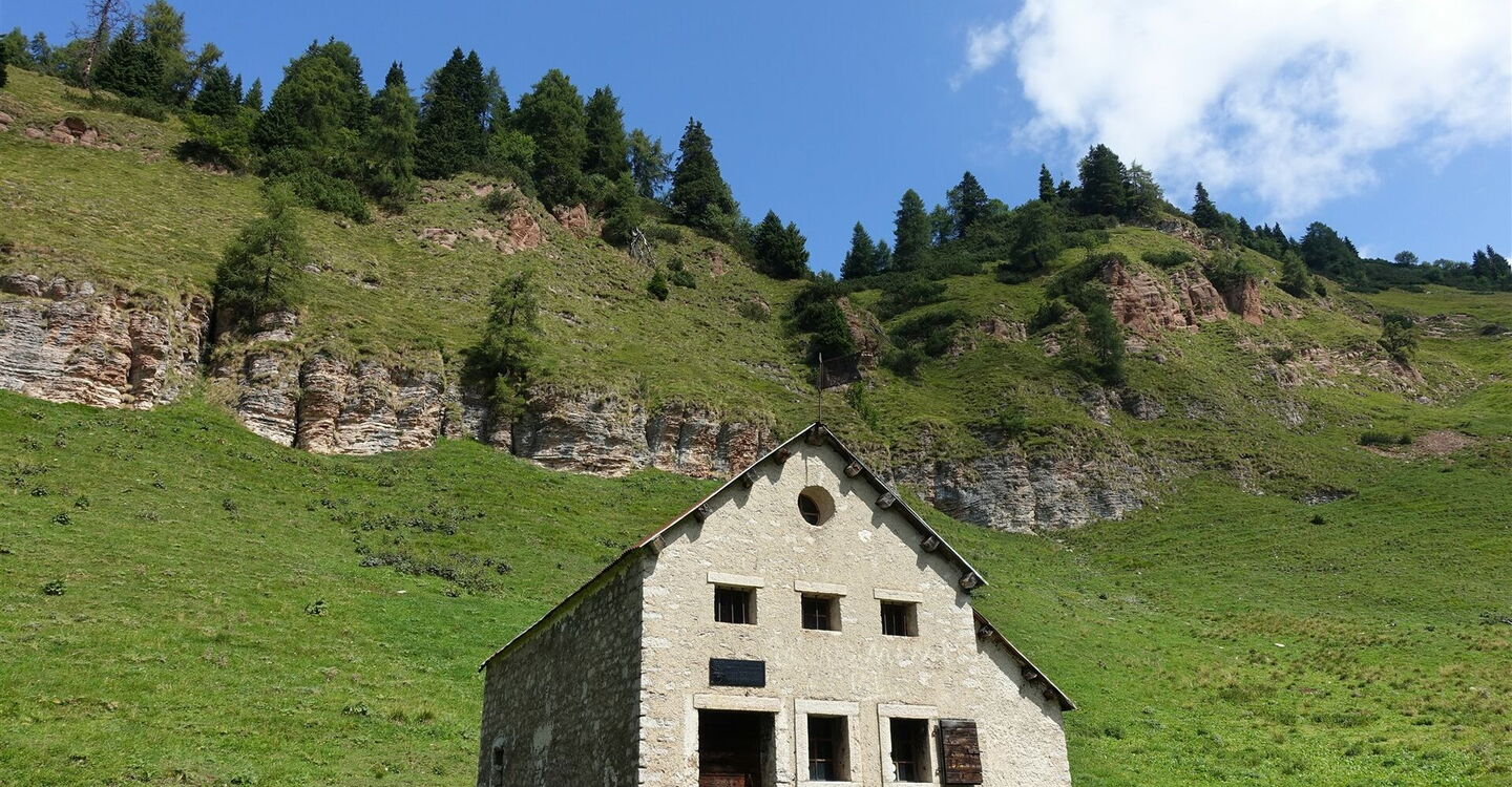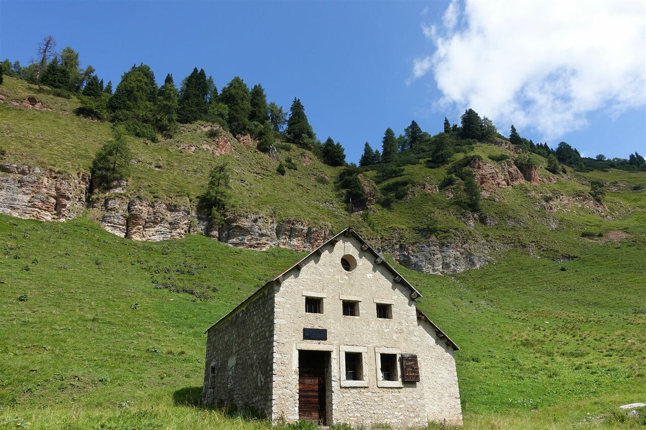 Auf dem Wanderweg 482 steigen wir extrem steil auf rutschigen Bergwiesen ab. Da der Pfad selten begangen wird, ist er zudem schwer auszumachen. Wir erreichen eine Zisterne und Ruinen, von nun an ist der Pfad wieder ausgeschildert – Richtung Casera Pezzei 05 Bivacco Tovanella (1.688 m), unser heutiges Tages- oder Etappenziel.