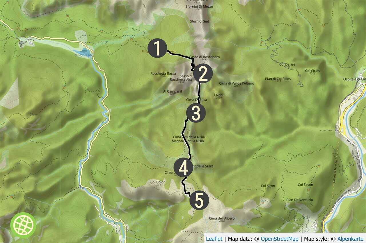 Wir gehen in nordöstlicher Richtung um das 01 Rifugio Bosconero (1.457 m) herum, um dann in östlicher Richtung auf dem Wanderweg 490 durch den Wald aufzusteigen. Bereits im Reich der Latschenkiefern angekommen gabelt sich der Pfad. Beide Wege sind zielführend und verlaufen unterhalb der extrem steil aufragenden Nordwand des 2.404 m hohen Rocchetta Alta. Kurz vor der Scharte führen beide Pfadspuren wieder zusammen. Dort quert auch der Wanderweg 482 und wir beginnen mit dem steilen Aufstieg durch ein nicht enden wollendes Geröllfeld.